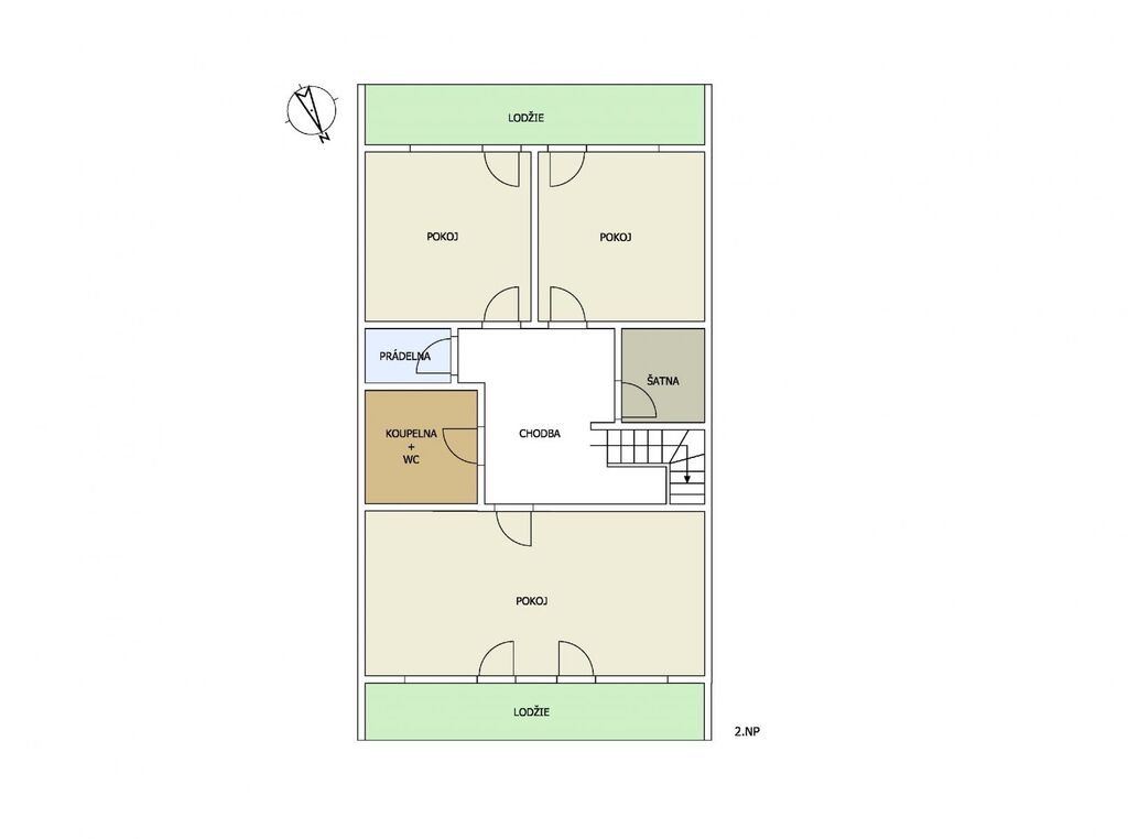 Ve 2. NP jsou umístěny 2 pokoje se spojenou lodžií, velká ložnice také s lodžií, koupelna s vanou a wc, šatna a prádelna.