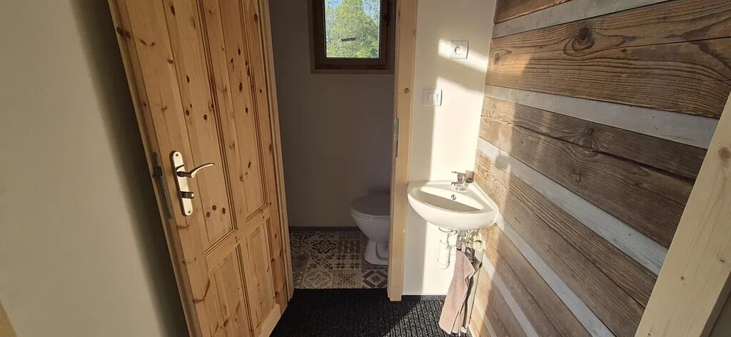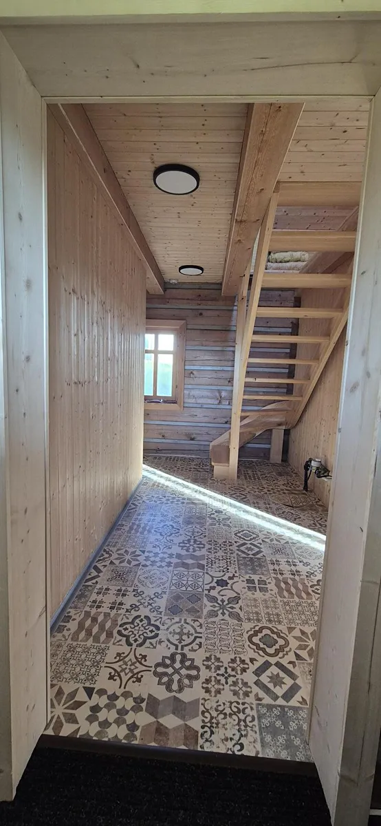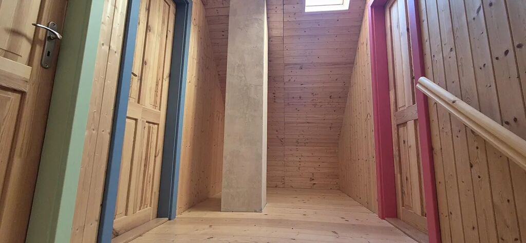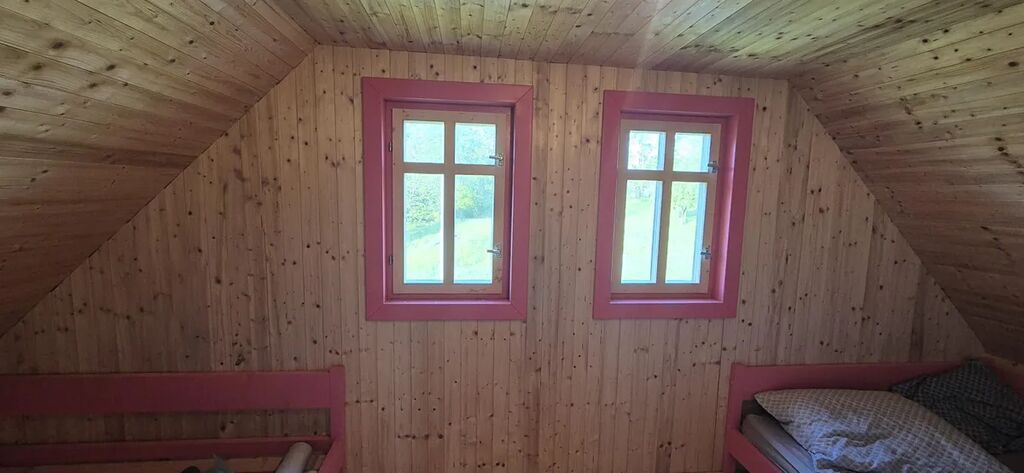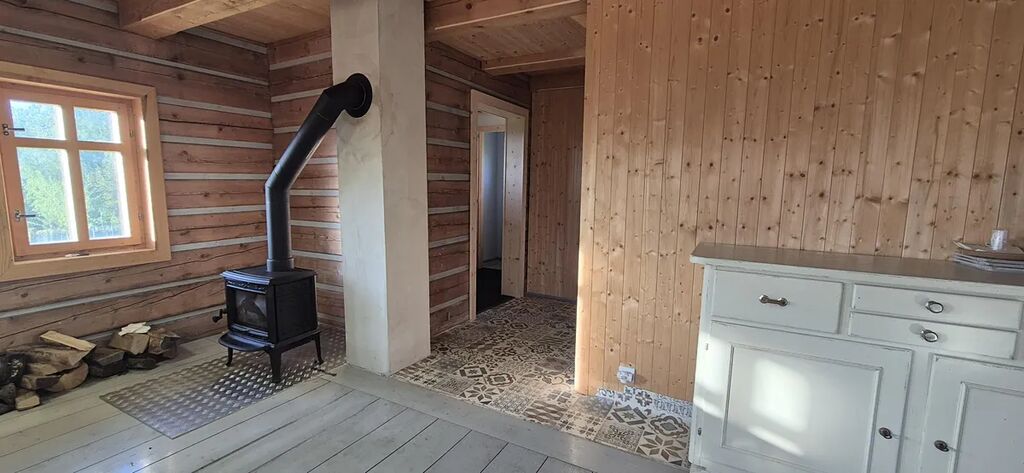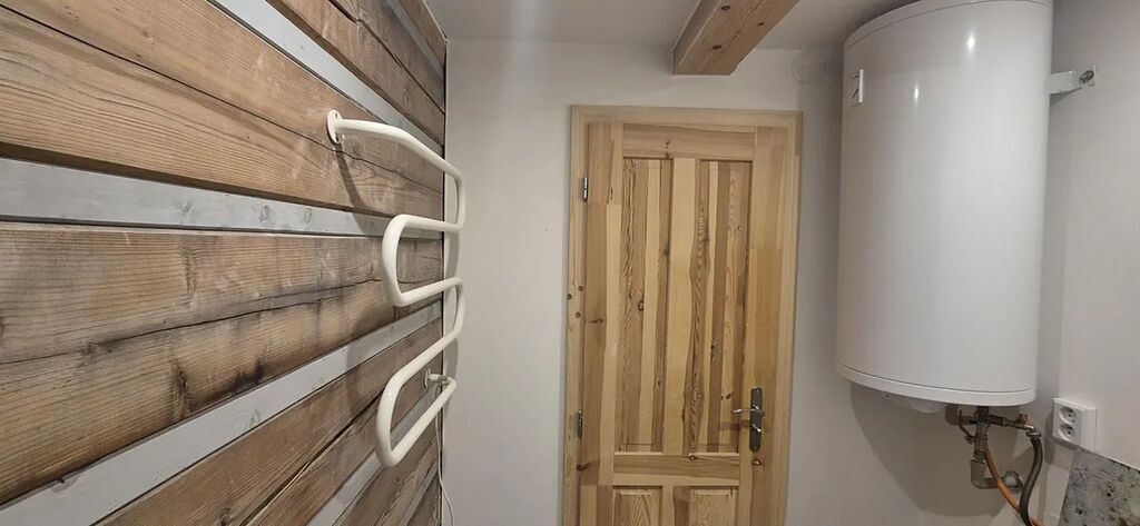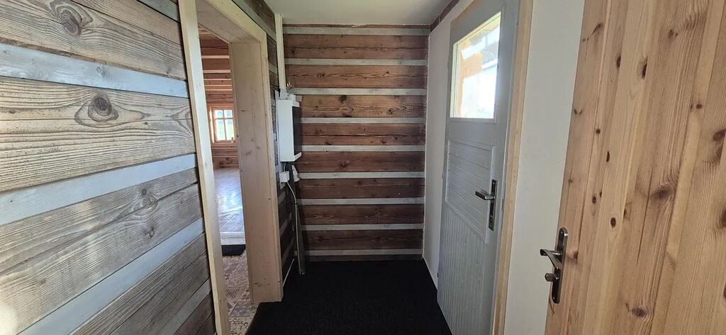 vybavená velkým jídelním stolem a lavicemi z masivu. Koupelna se sprchovým koutem a dřevěné schodiště vedoucí do parta se třemi pokoji vybavenými postelemi na míru. Vytápění je zajištěno novými krbovými kamny zn. Jotul s výkonem 9 kW, v koupelně je na stěně umístěno topné tělěso-žebřík, v patře je možné si přitopit v každém pokoji přímotopy. Ohřev vody el. bojlerem. Dotvoření interiéru dává možnost seberealizace dle vlastního vkusu.