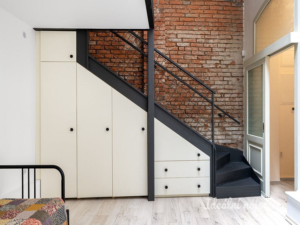 Na galerii se nachází vestavěná kovová manželská postel navazující na zábradlí a schodiště, dále pracovní stůl, komoda a skříňka se zásuvkami. V koupelně je sprchový kout, umyvadlo, pračka a WC. Úložné prostory doplňují vestavěné skříně v předsíni a pod schody.