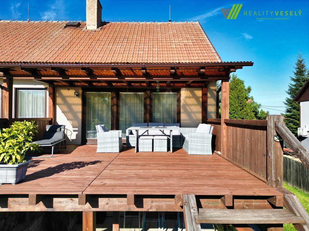 Z obývací části je vstup na velkou zastřešenou terasu s venkovním schodištěm do zahrady.