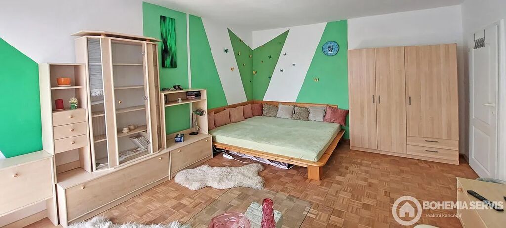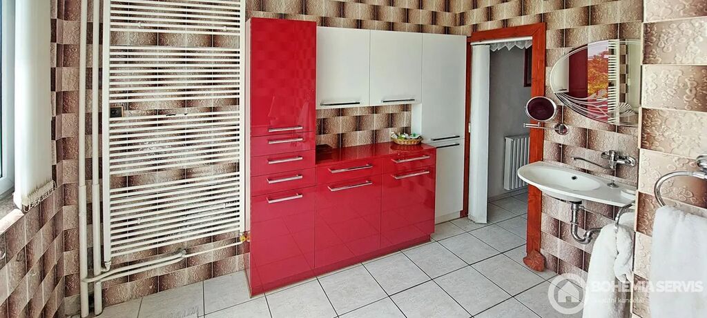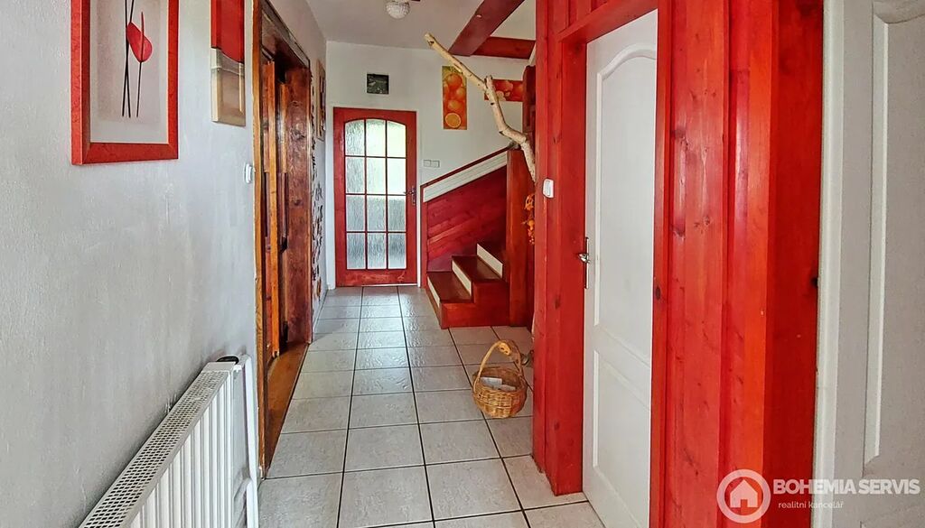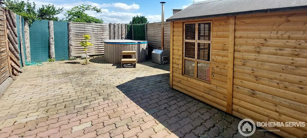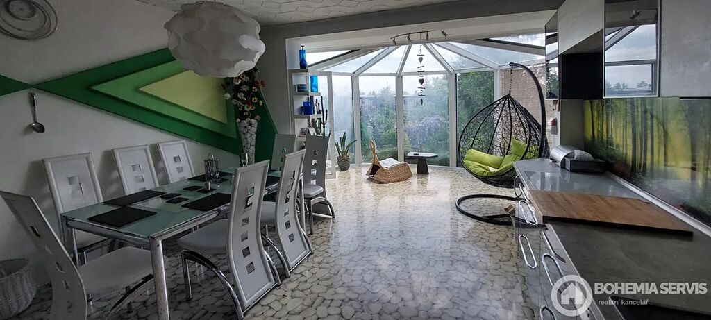 Rodinný řadový dům na jižním konci Čáslavi, užitná plocha 220 m2, s dispozicí 5+kk, pozemek 413 m2. Dům je vybavený solárními panely s dotovanou elektřinou, klimatizací a saunou v suterénní části domu. Okrasná zahrada poskytuje jedinečné soukromí s venkovním krbem a posezením na kamenné terase. Dále zde najdeme wellness koutek s nahřívacím sudem a chatkou pro soukromou relaxaci nebo posezení s přáteli. Dispozice interiéru: ze vstupní síně je vchod do chodby, Odtud vpravo do prostorné moderní kuchyně s jídelnou a zimní zahradou s výhledem do zeleně zahrady. Tento prostor je volně propojený s obývací částí domu, která je atypická s krbem a se vstupem na lodžii, Z chodby dále vedou dveře do suterénu, na WC, koupelny a schody do 1. NP. Tam najdeme pracovnu, dětský pokoj s lodžií, ložnici s vestavěnými skříněmi i lodžií a odpočinkový otevřený prostor. Celkově je interiér velmi světlý, prostorný a vkusně zařízený.