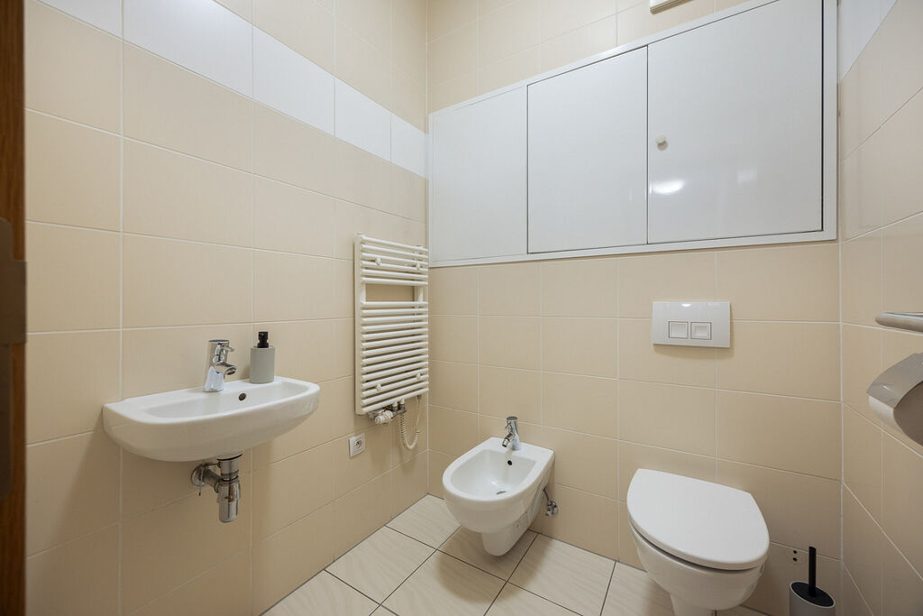 Ložnice disponuje postelí a komodou, na chodbě se nachází vestavěné skříně s dostatkem úložného prostoru. Koupelna je vybavena vanou, k dispozici jsou dvě samostatné toalety.