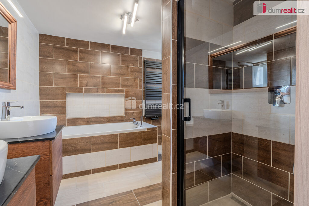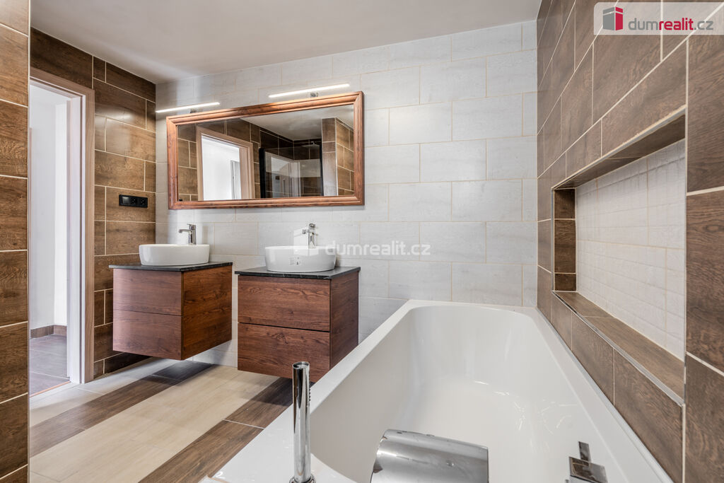 Koupelna a oddělené WC jsou již připraveny k užívání. V koupelně není nutné se střídat, protože díky dvěma umyvadlům, vanou s masážní tryskou a vyzděným sprchovým koutem ji můžete využívat s více členy domácnosti. Je zde i prostor pro pračku a sušičku a umístěný úsporný kombinovaný plynový kotel s částečným podlahovým topením.