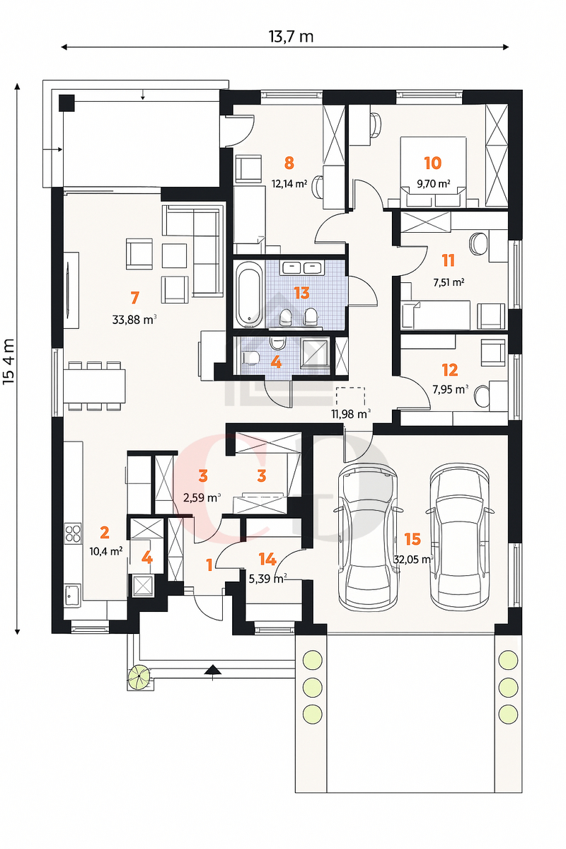• technickou místnost, šatnu a dvojgaráž s přímým vstupem do domu.