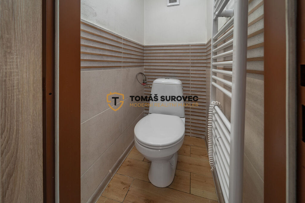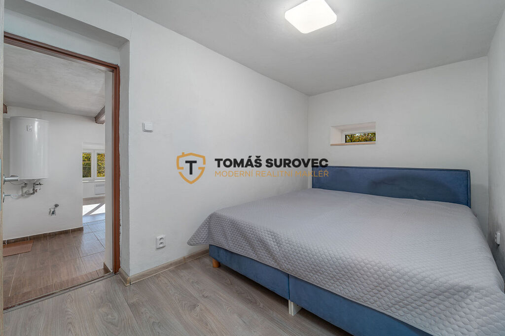 U vstupních dveří se na jedné straně nachází samostatné WC a na druhé straně koupelna. Srdcem domku je vybavená kuchyň se zánovní, moderní kuchyňskou linkou, dřevěným jídelním stolem a židlemi. Na stropě zaujmou dekorativní dřevěné rámy, navozující tradiční atmosféru. Průchozí je vstup do největší místnosti, částečně vybavené obývací části s krbovými kamny. Z kuchyně vedou dveře do neprůchozí ložnice. Ve všech místnostech jsou instalovány elektrické přímotopy.