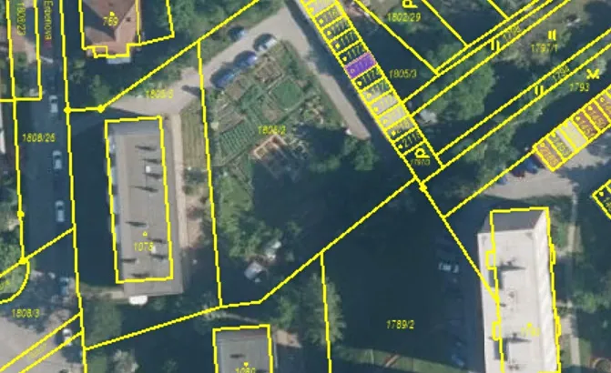 Garáž stojí na vlastním pozemku, pozemek před garáží a příjezdová cesta je ve vlastnictví města Tišnov.