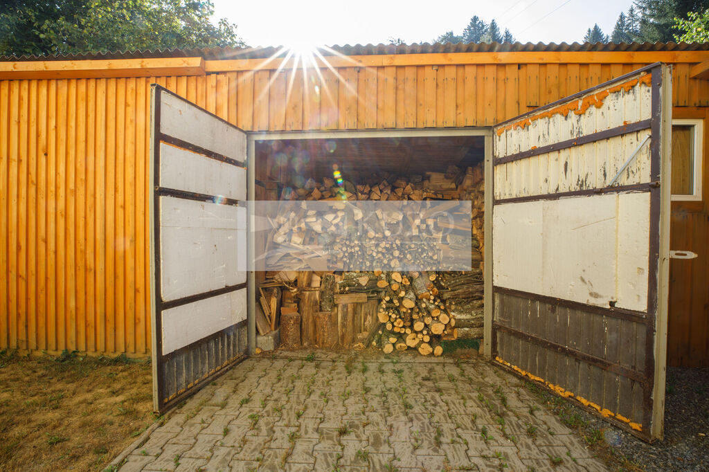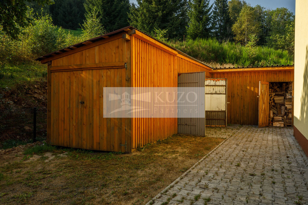 K domu přiléhá zastřešená terasa vhodná k příjemnému posezení. V zadní části zahrady se nachází prostorný dřevěný přístřešek ke stání aut. Na zahradě je také vodní nádrž s chovnými rybami. Vjezdová brána reaguje na dálkové ovládání prostřednictvím aplikace v telefonu.