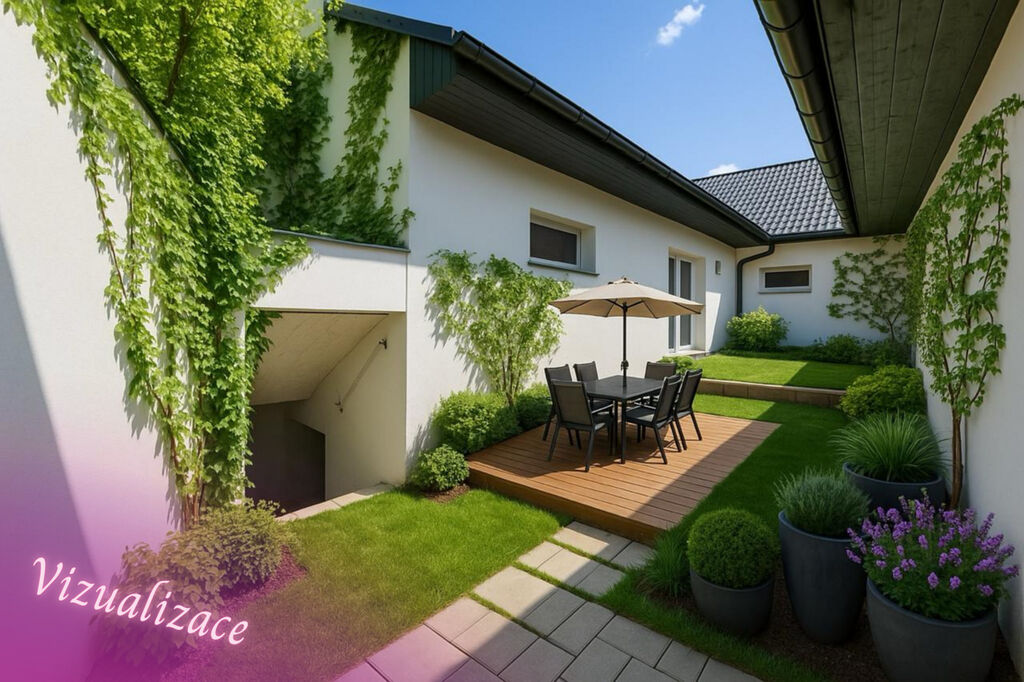 Na uzavřeném dvoře najdete přípravu na vířivku, zděný zahradní domek (20 m²) a vstup do sklepa (cca 56 m²) – ideální pro vinný sklípek nebo relaxační zónu.