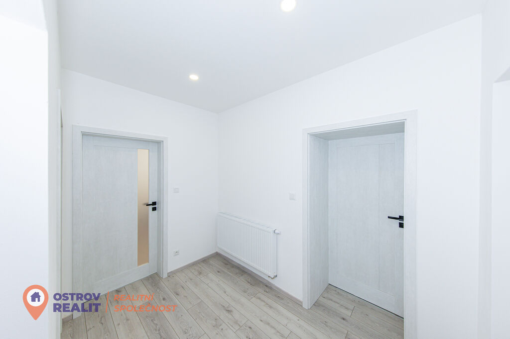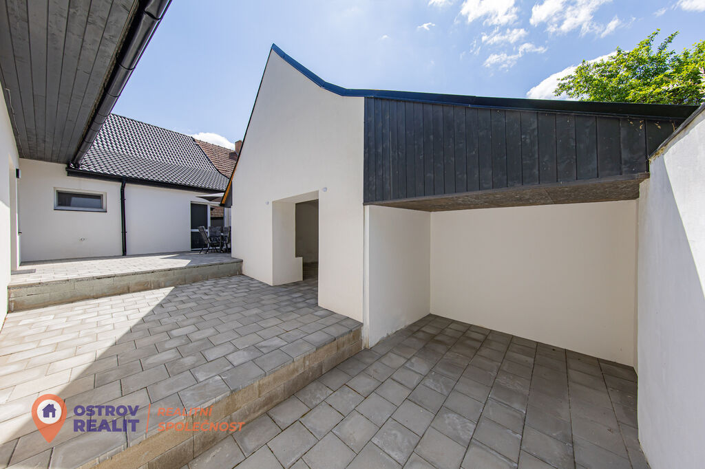 Po vstupu vás přivítá světlé zádveří a prostorná hala, odkud plynule přejdete do otevřeného obývacího prostoru s výstupem na dvůr.
