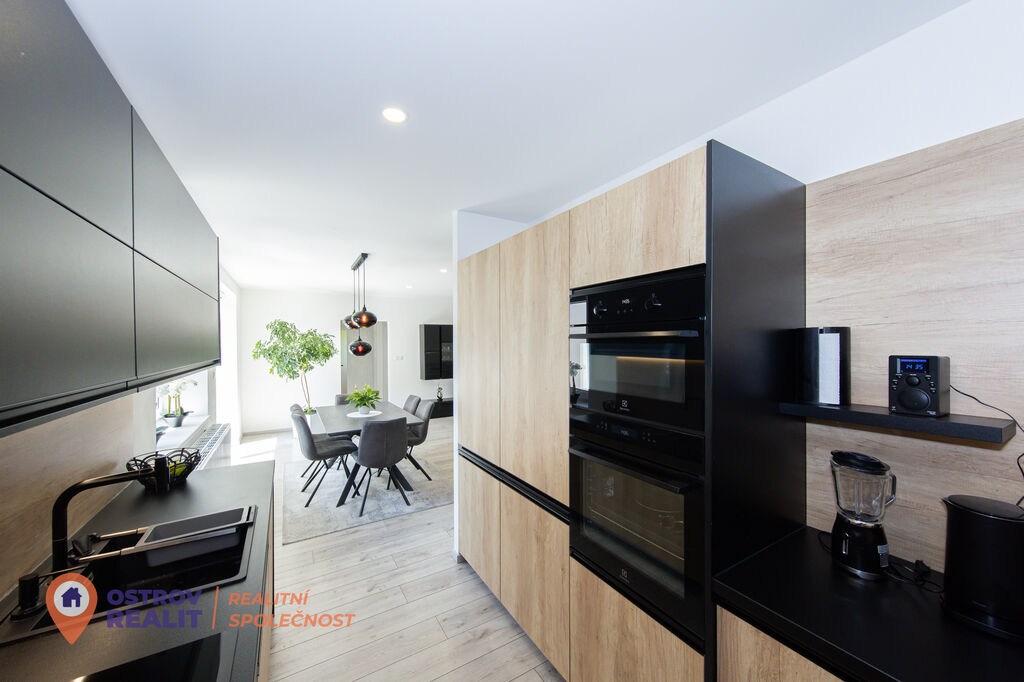 Na obývák navazuje elegantní kuchyně s vestavěnými spotřebiči. Další pokoje: hlavní ložnice, pokoj pro hosty, samostatná pracovna se vstupem na dvůr, šatna, technická místnost, dvě koupelny a dvě toalety – vše promyšlené do posledního detailu.