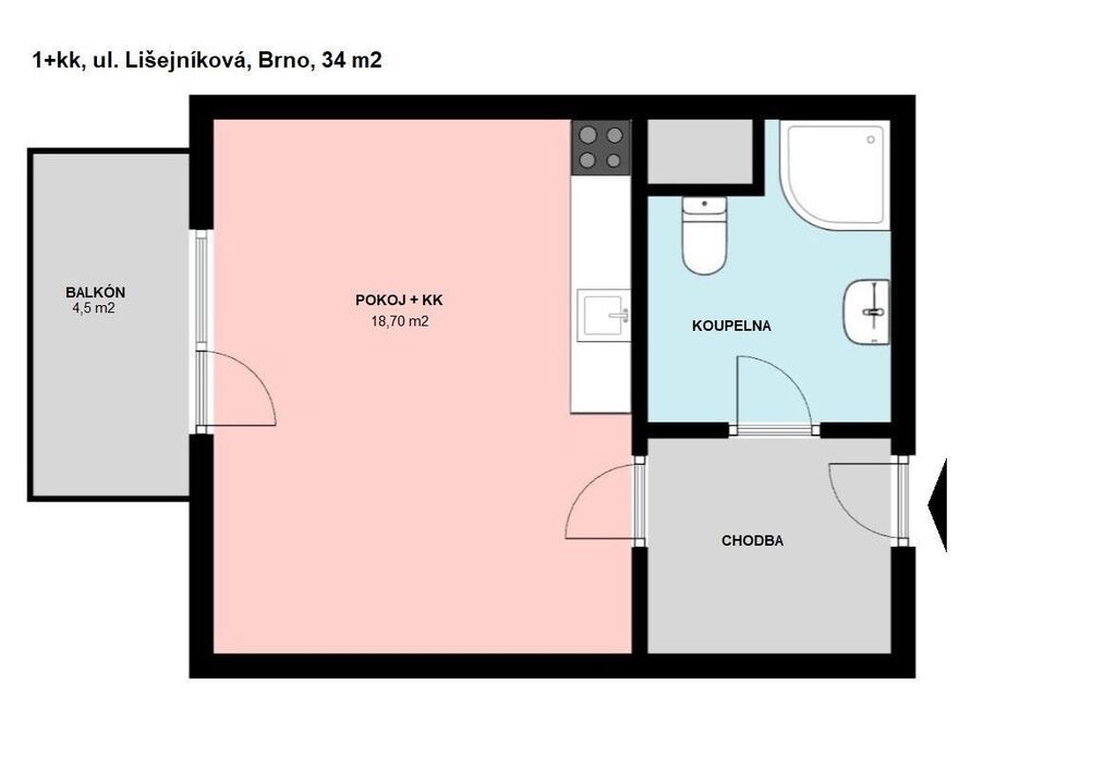 Velikost místností - pokoj s kk 18,7 m2, koupelna s toaletou 6,3 m2, předsíň 4 m2.