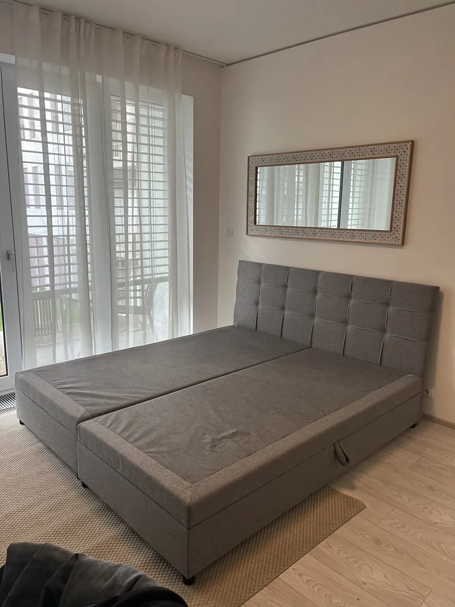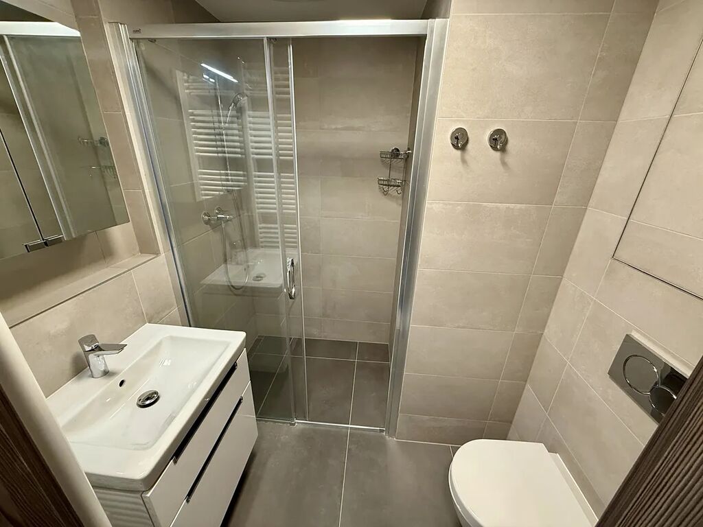 Nová kuchyňská linka se spotřebiči (lednička s výparníkem, varná deska, digestoř, elektrická trouba, prostor na MV troubu, myčka 45 cm, pračka, dřez, baterie), jídelní stůl, 2x židle, TV stolek, křeslo + konferenční stolek, postel. Koupelna (prostorná sprcha, umyvadlo se skříňkou, zrcadlová skříňka, závěsné WC, topný žebřík), hala (skříně, věšáková stěna), světla, venkovní žaluzie, stolek + dvě židle (balkon).