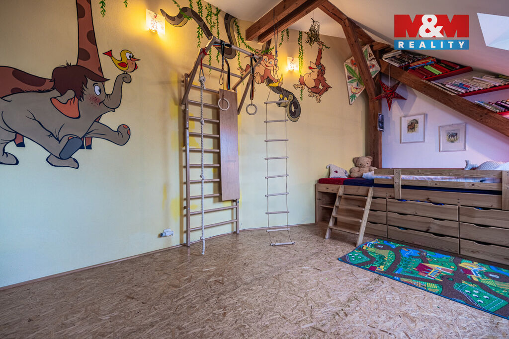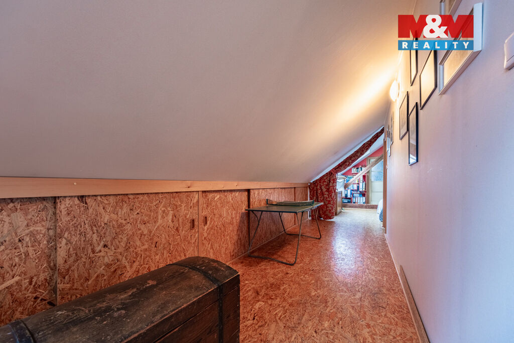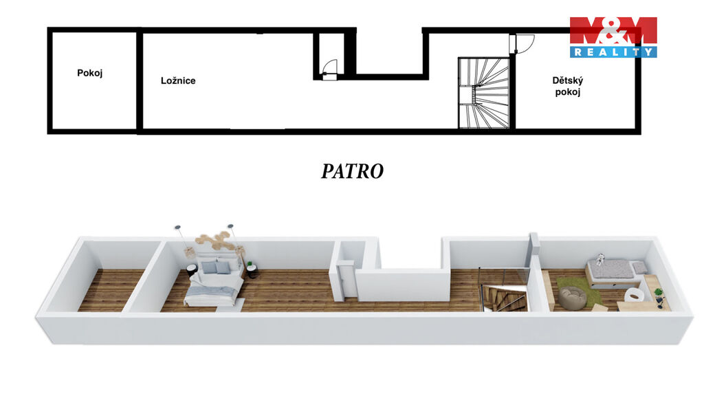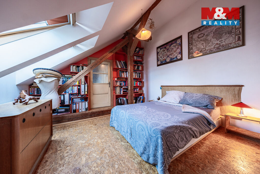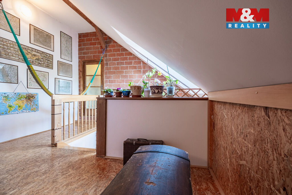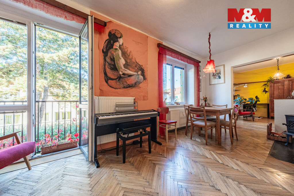 Ve spodním podlaží Vás přivítá předsíň a prosluněný obytný pokoj se stylovými kamny. Otevřený průhled do patra dodává bytu vzdušnost; na druhém konci je velká kuchyně s pracovním koutem. Všude masivní dřevěné parkety, z předsíně vstup do koupelny s vanou a WC. Po dřevěném schodišti vystoupáte na galerii s knihovnou. Napravo je dětský pokoj, nalevo samostatné WC, dále světlá ložnice a za ní prostorná šatna.