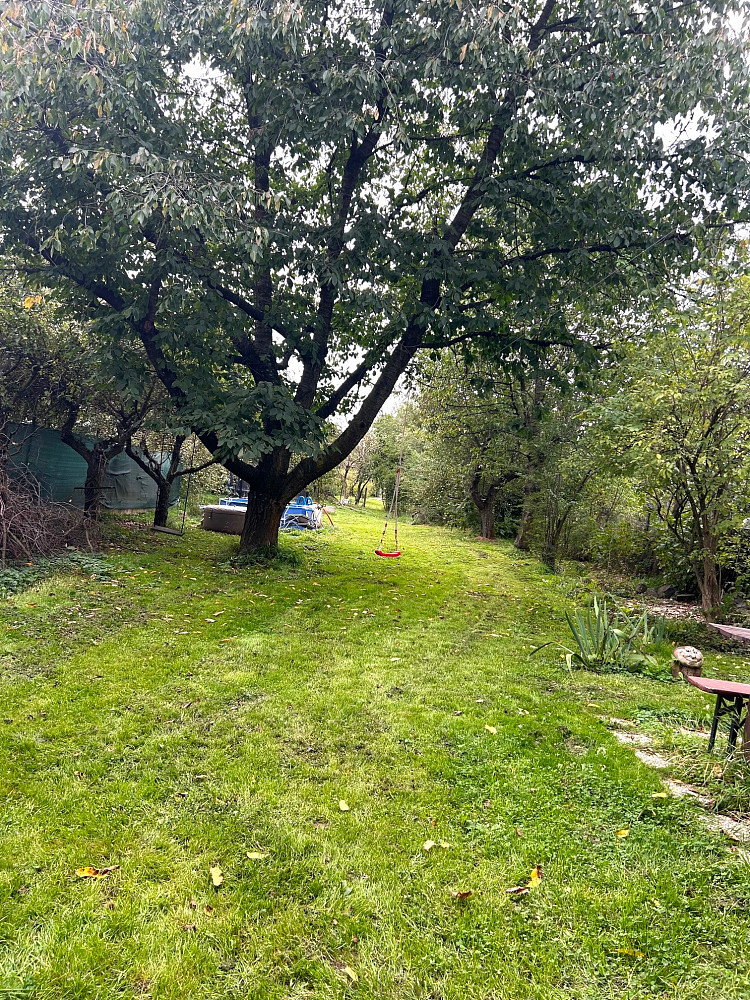 Součástí pozemku je prostorná, rovinatá zahrada s ovocnými stromy a vzrostlými dřevinami, která poskytuje klid a soukromí.