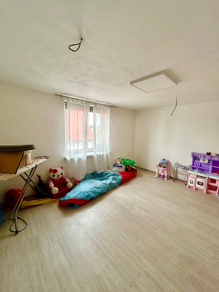 V patře je jeden obytný pokoj a prostorný půdní prostor, který může být po úpravě využit jako další obytná část.