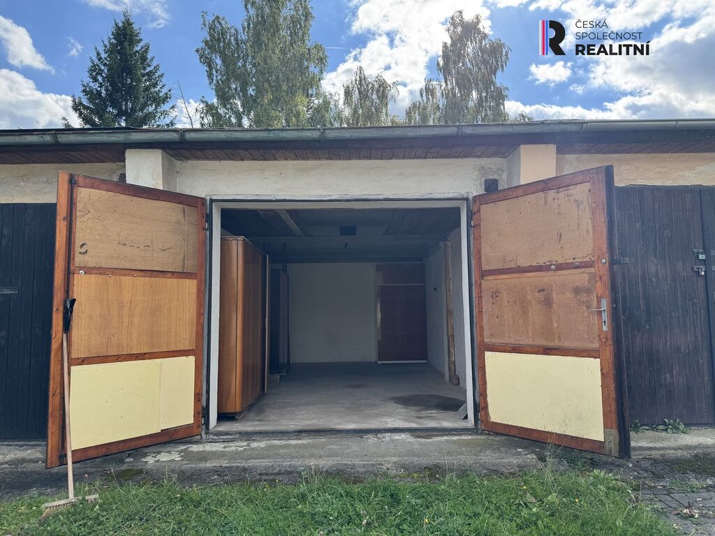 Garáž je v dobrém stavu, má dřevěná dvoukřídlá vrata.
