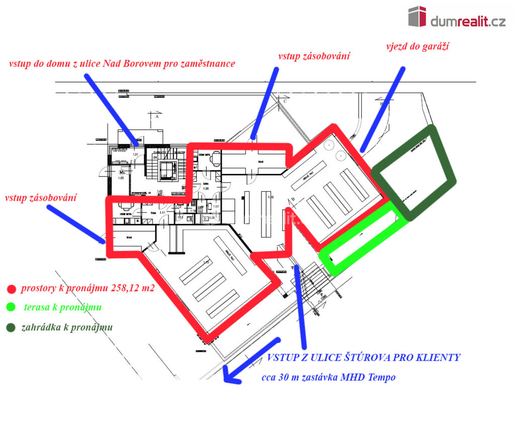 Dumrealit.cz Vám zprostředkuje exkluzivně pronájem zcela nového komerčního prostoru o velikosti 258,12 m², v nově stavěné budově (PENB – B) přímo u budoucí stanice metra D - Nové Dvory (přes ulici Štúrova), která bude dokončena v druhé polovině roku 2026. Tento prostor se nachází v přízemí třípatrové nízkoenergetické budovy, kde v přízemí je nabízený prostor o velikosti 258,12 m², který bude mít hlavní vstup z ulice Štúrova přímo od zastávky MHD / Bus – Tempo, vstup bude přes schodiště a také bude plně bezbariérový. Prostor 258,12 m² může být jako obchodní (např. kavárna, prodejna, pekárna) nebo jako kancelář / showroom nebo i ordinace, výběr je plně na klientovi. Prostor lze plně modifikovat, lze ho na přání rozdělit na dva samostatné prostory (133,49 m² a 105,56 m²) s vlastím zázemím a samostatnými vstupy. K dispozici budou dvě toalety, 2 x šatna, 2 x předsíň a 2 x úklidová místnost. K prostoru lze dopronajmout venkovní terasu a menší zahrádku, dále parkovací stání a popř. sklepy. V domě bude 12 parkovací stání v suterénu domu, 6 x sklep a dále lze pronajmout až 3 venkovní parkovací stání. Aktuálně se v domě instalují okna, sdk příčky a klimatizace.Tato budova bude dokončena a zkolaudována v druhé polovině roku 2026, již nyní mohou probíhat prohlídky a úpravy prostor před dokončením přímo na přání nového nájemce. Velmi doporučuji všem zájemcům, kteří již nyní hledají atraktivní prostor u budoucí stanice metra D – Nové Dvory, v ulici Štúrova, Praha 4. Ev. číslo: 652596.