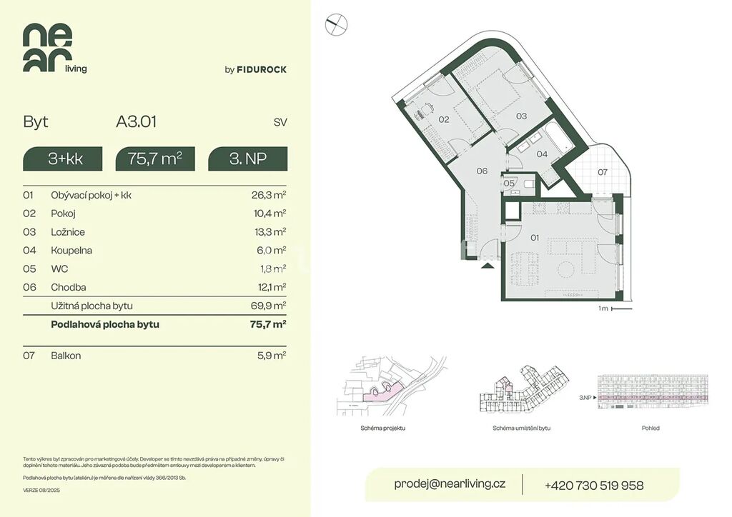 Nabízíme k prodeji byt 3+kk o podlahové ploše 75,7 m² s balkonem 5,9 m² v developerském projektu NEAR living v Praze 8, vznikajícím na pomezí Palmovky a Karlína.