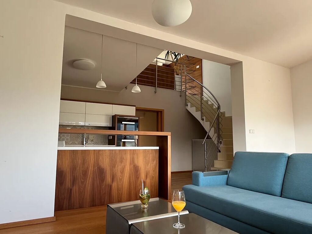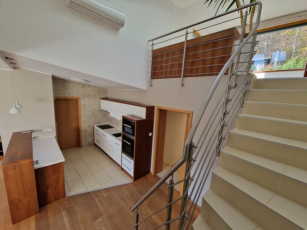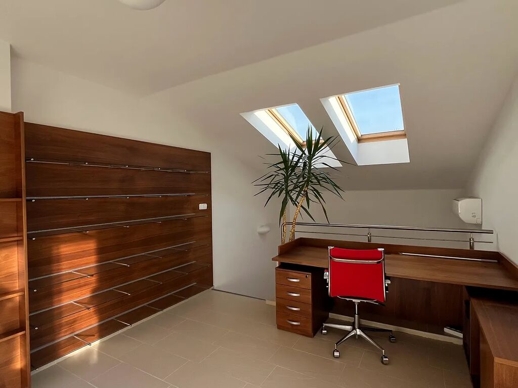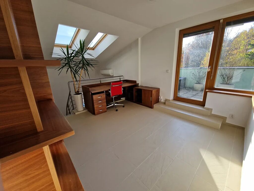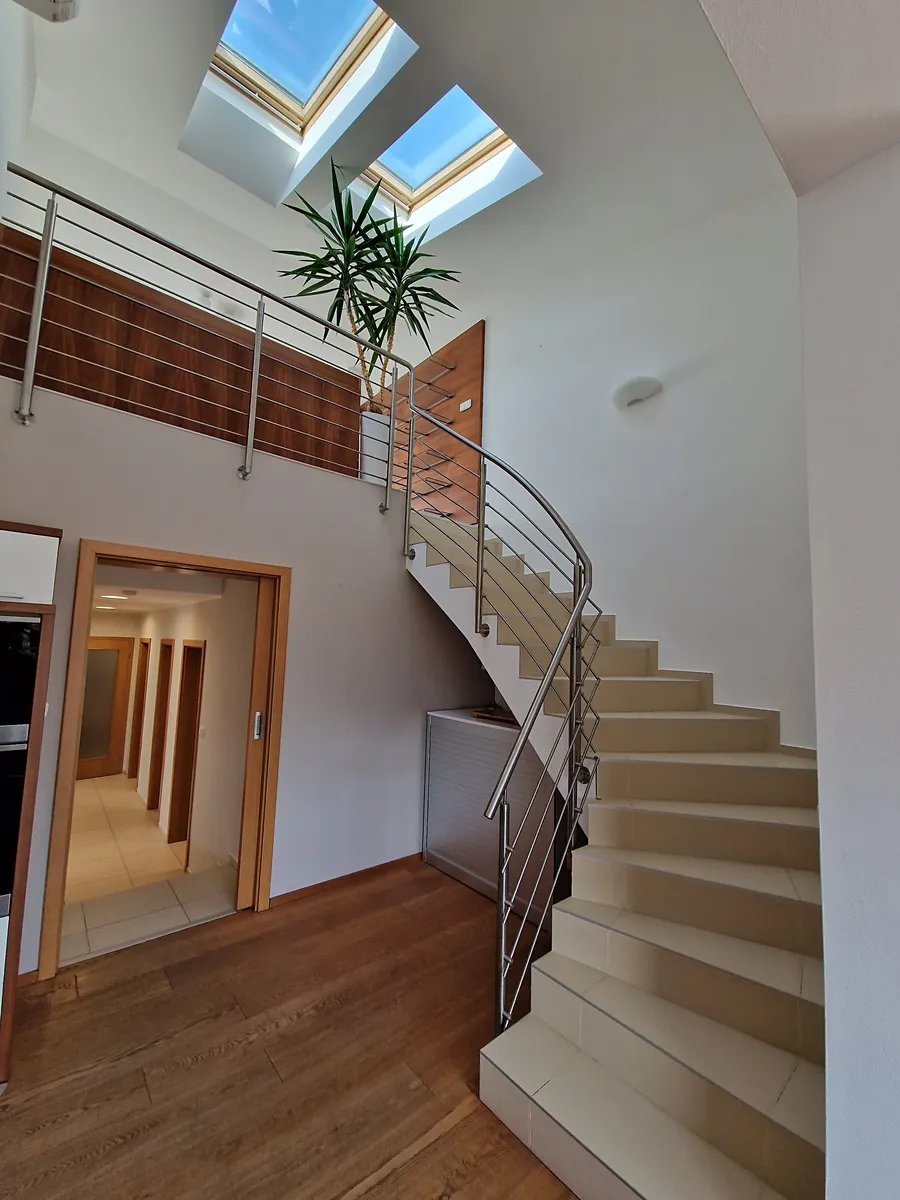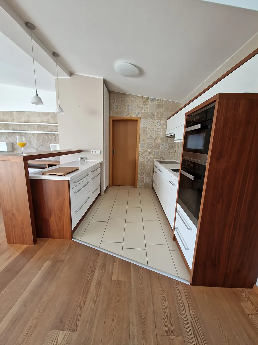 Hlavní obývací prostor je propojen s moderní kuchyní s čistými liniemi, kompletně vybavenou vestavnými spotřebiči Miele. V bytě jsou použity jen kvalitní materiály a dýchá z něj atmosféra noblesy a pohody. Z hlavního obývacího prostoru je přímý vstup na balkon a vedou z něj schody do patra, které je možno využít jako pracovnu či relaxační prostor. Na tento prostor navazuje vstup na úchvatnou střešní terasu, která svými výhledy a možnostmi využití okouzlí snad každého. Byt má dále 2 prostorné ložnice, šatnu, koupelnu, samostatné WC, vstupní chodbu s vestavnými skříněmi.