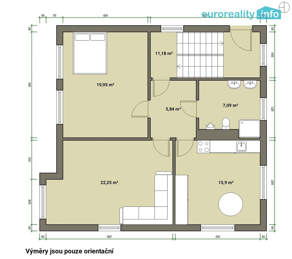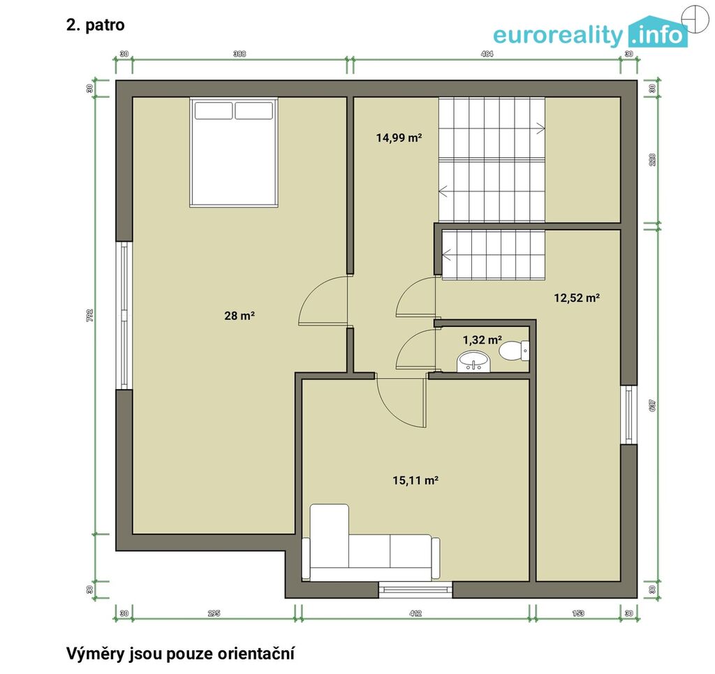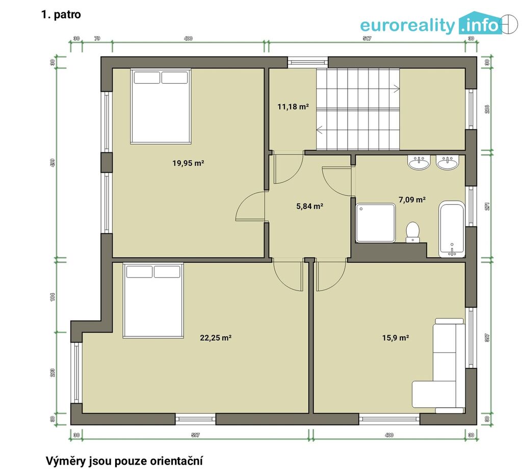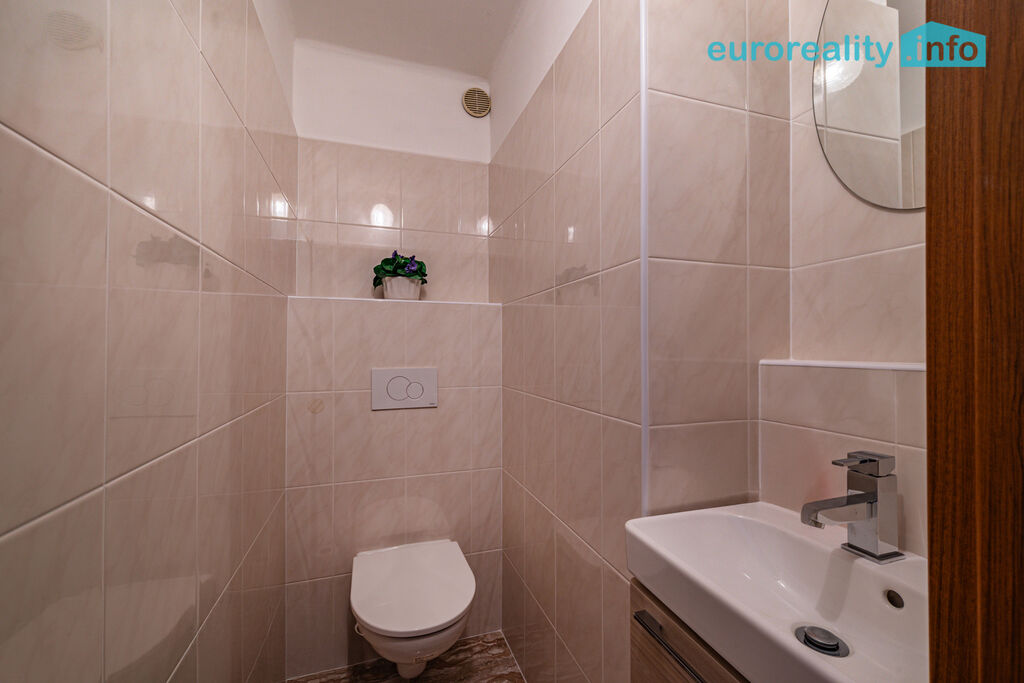 V prvním patře je byt o dispozici 2+1, je rozdělen na kuchyň, obývací pokoj, ložnici, chodbu, koupelnu a samostatné WC.