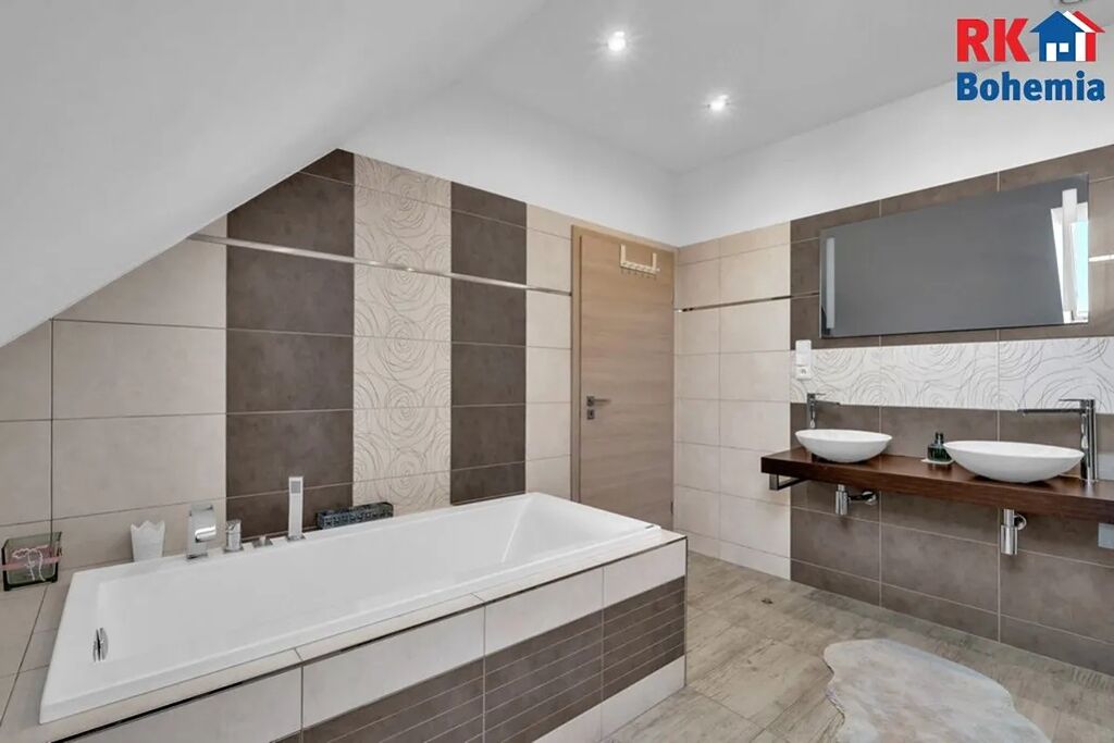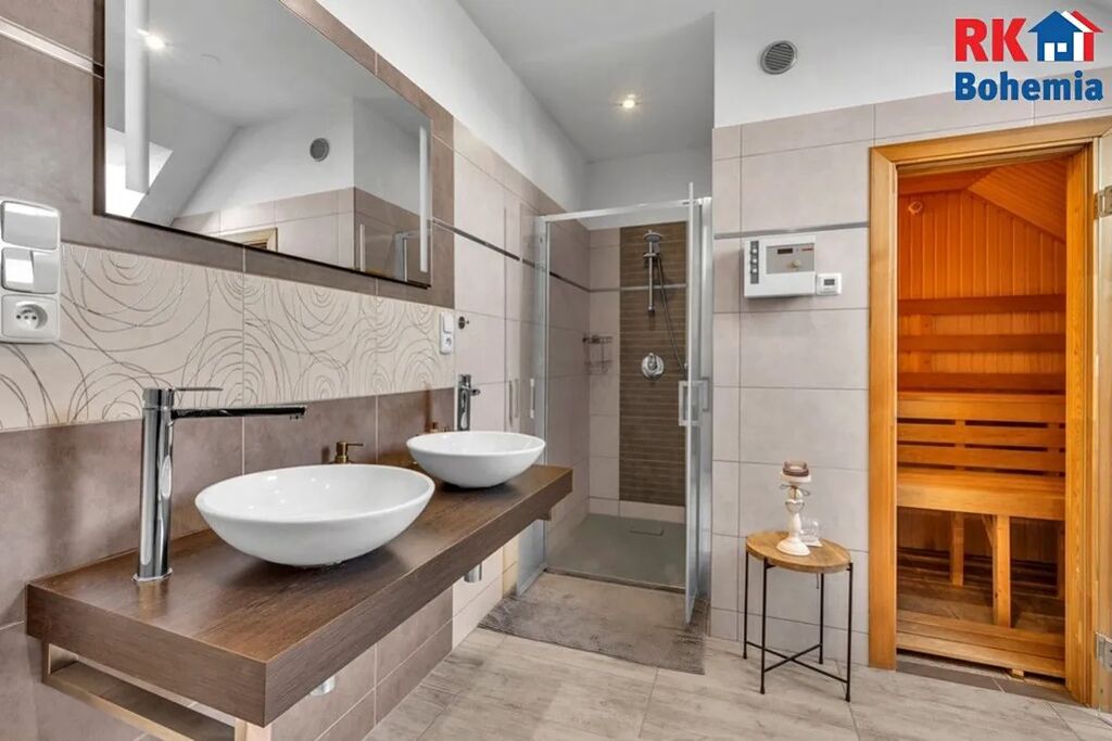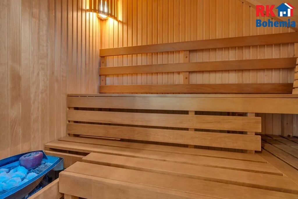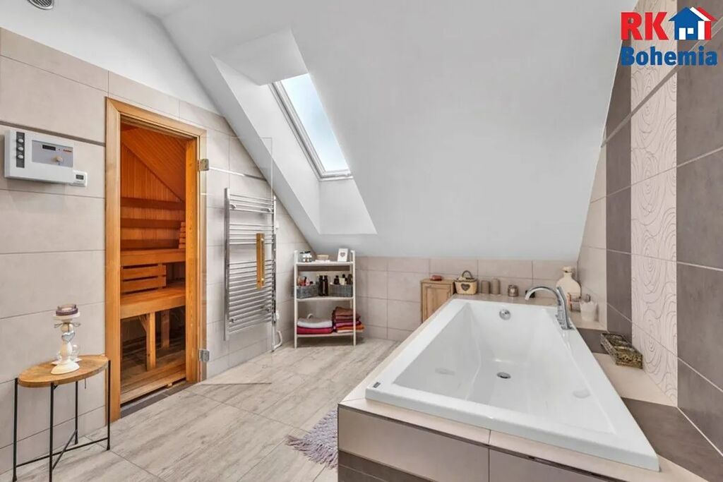 Pracovna - Tři ložnice - Chodba - Koupelna s vanou, sprchovým koutem, dvěma umývadly a saunou - Samostatná toaleta.