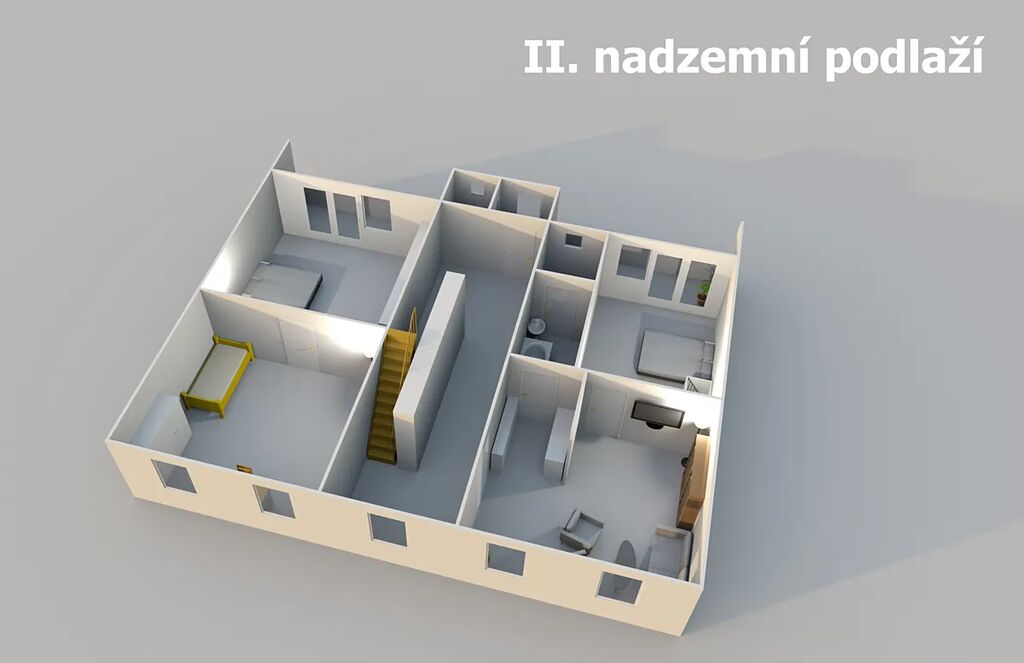 - Druhý a třetí byt připraven k úpravám: prázdný, s plastovými okny (vyměněnými v roce 2008). Pro přehlednost je do fotogalerie zařazena vizualizace jednotlivých místností (doplnění nabytkem).