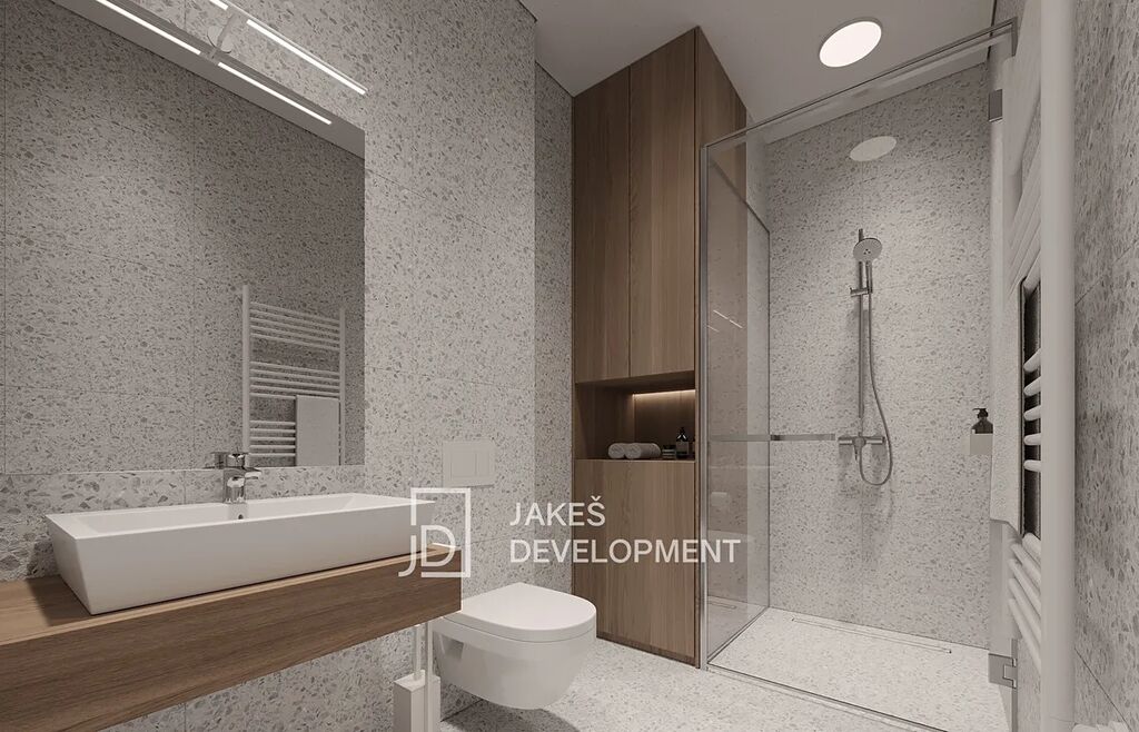 Vytápění je zajištěno radiátory ve všech obytných místnostech i koupelně. Byt bude dokončen s kvalitními vinylovými podlahami, elegantní koupelnou s keramickým obkladem a moderními interiérovými dveřmi. Byt disponuje kuchyňskou linkou s vestavěnými spotřebiči, osvětlení a garnýže. Po dohodě je také možnost pronajmout parkovací stání za 1500,-Kč / měsíčně. K pohodlí obyvatel domu přispívá také společné venkovní posezení ideální pro odpočinek, a praktický uzamykatelný box na kola s kapacitou až 10 kol.