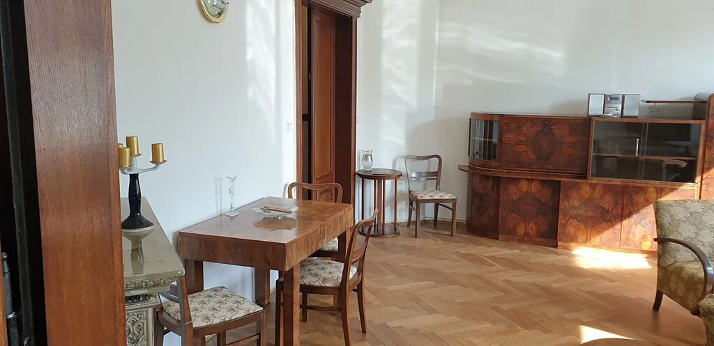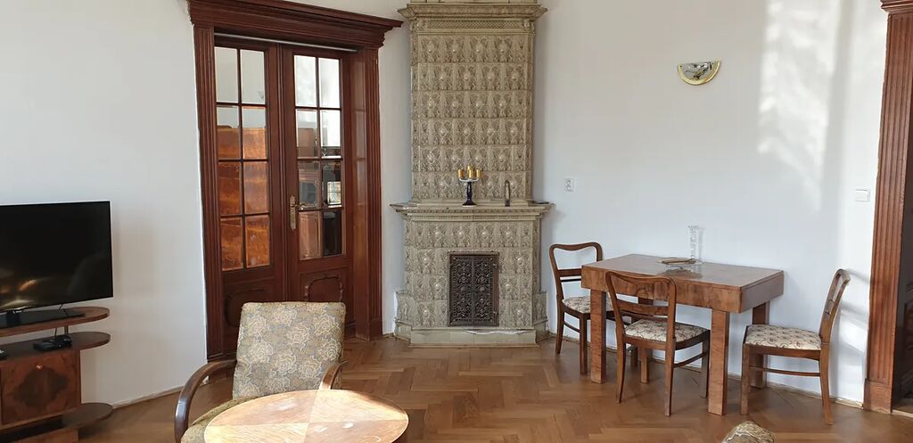 Byt je částečně vybaven prvorepublikovým nábytkem v obytných místnostech, krásnými kachlovými kamny (nejsou funkční). Podlahy renovované parkety a původní dlažba. Okna jsou již nová plastová včetně žaluzií a kuchyňská linka moderní včetně spotřebičů.