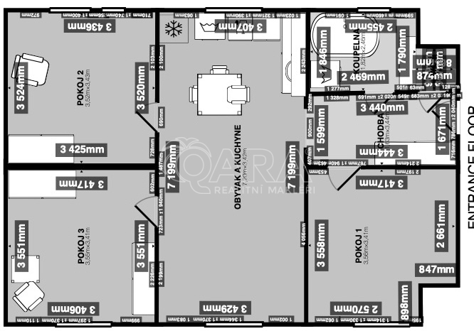 Středová hlavní místnost, která slouží jako obývací pokoj s kuchyňským koutem je orientovaná na dvě světové strany a zajišťuje tak dostatek světla. Za ní se pak nachází dva pokoje, jeden s výstupem na terasu.