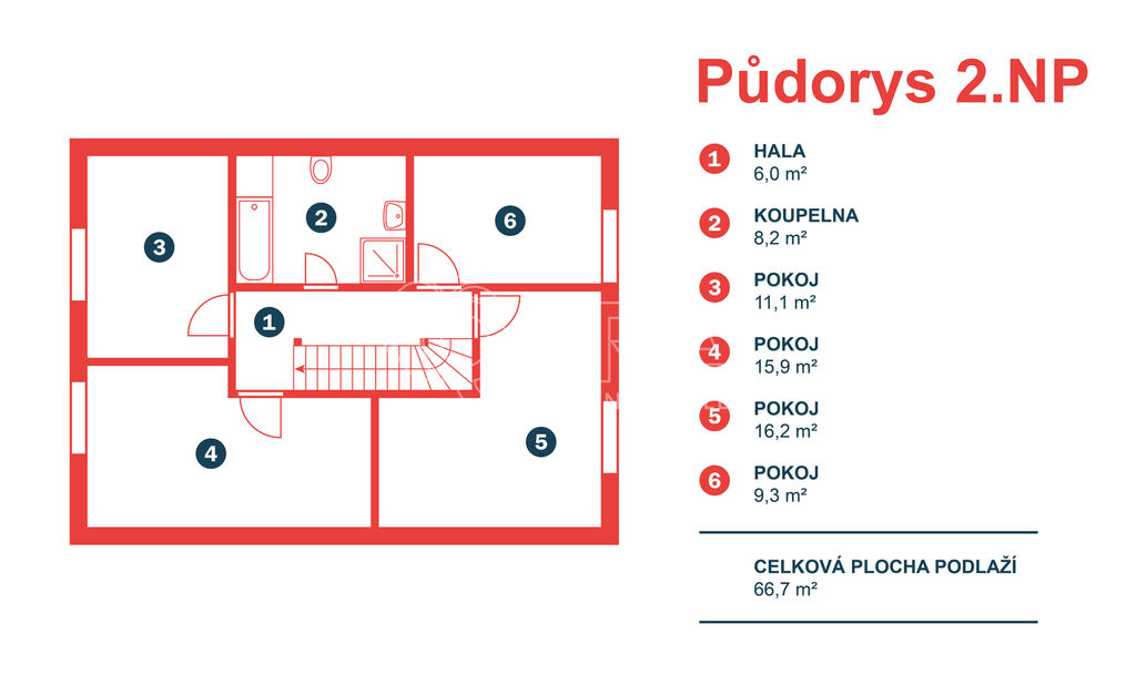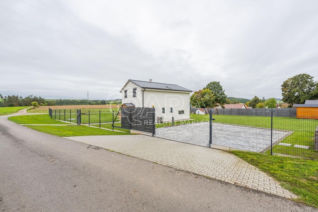 Dvoupodlažní rodinný dům o celkové ploše 136,9 m² se rozkládá na pozemku o výměře 1851 m². Dům je dispozičně řešen jako 6+kk s přímo navazující terasou. Dům sestává z obývacího pokoje s kuchyňským koutem, pěti pokojů, technické místnosti, spíže, chodby, koupelny se sprchovým koutem a WC v prvním patře a koupelny s vanou, sprchovým koutem a WC ve druhém patře. Z pozemku je krásný výhled na les.