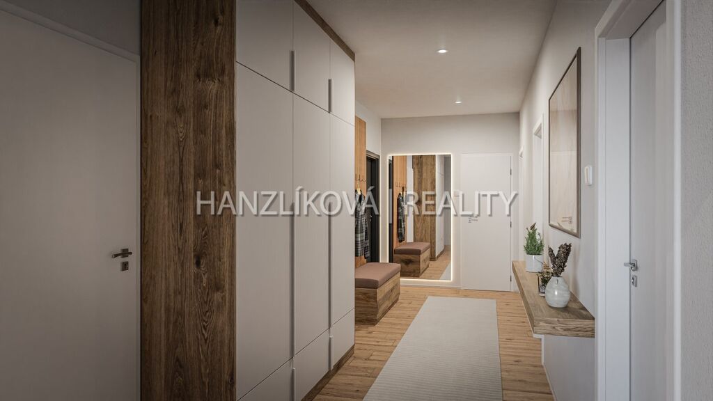 prostorné chodby, která nabízí dostatek místa pro vestavné skříně a úložné prostory celé rodiny, dvou koupelen, přičemž jedna slouží jako rodinná a druhá je součástí ložnice, samostatné toalety, hlavní obytné části s kuchyňským koutem a jídelnou, ze které je přes portálové dveře vstup na terasu a zelené plochy, 3 pokojů, šatny, pracovny a ložnice. Součástí bytu je terasa o výměře 19,48 m2 a zelená střecha o výměře 12,47 m2 a 4,9 m2 a dále sklepní kóje umístěná v suterénu domu.