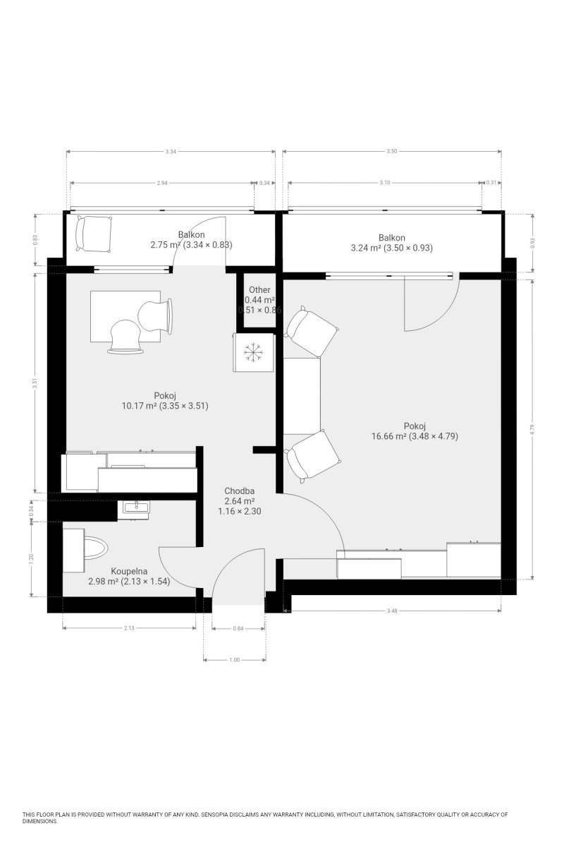 Dispozici tvoří prostorný obývací pokoj, samostatná kuchyně s jídelním koutem, koupelna s vanou, umyvadlem a toaletou a vstupní chodba s úložným prostorem. K bytu náleží také zasklená lodžie s výhledem do zeleně a sklepní kóje v suterénu domu.