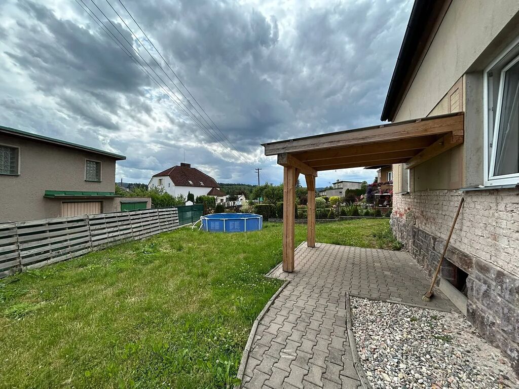 Za domem je dřevěná vedlejší stavba, která může být využita jako garáž.