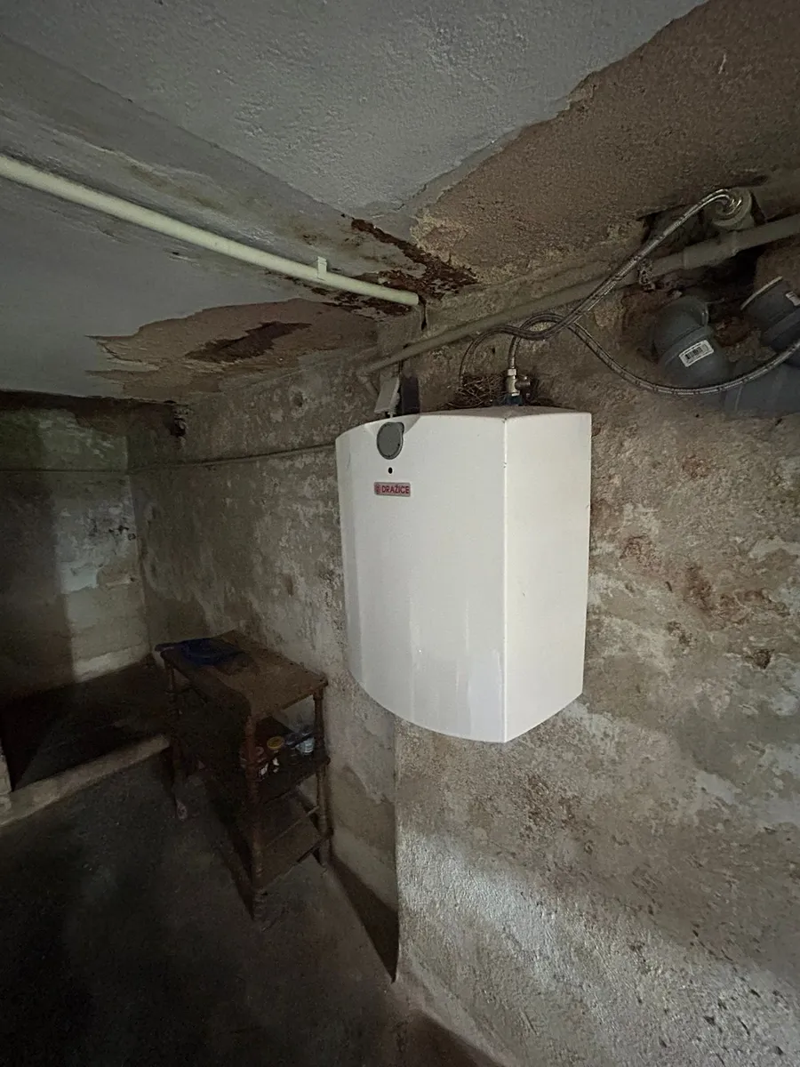Dům je vytápěný kotlem na tuhá paliva. Ohřev TUV - el.bojler.