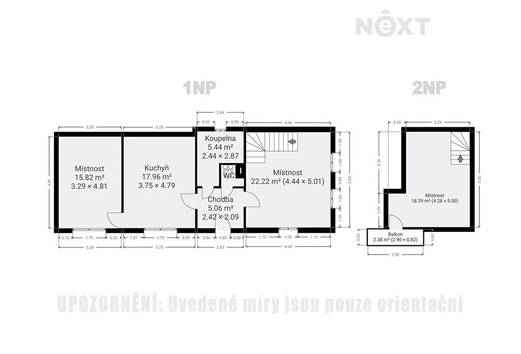1NP - zádveří, koupelna, samostatné WC, kuchyně, pokoj, obývací pokoj
