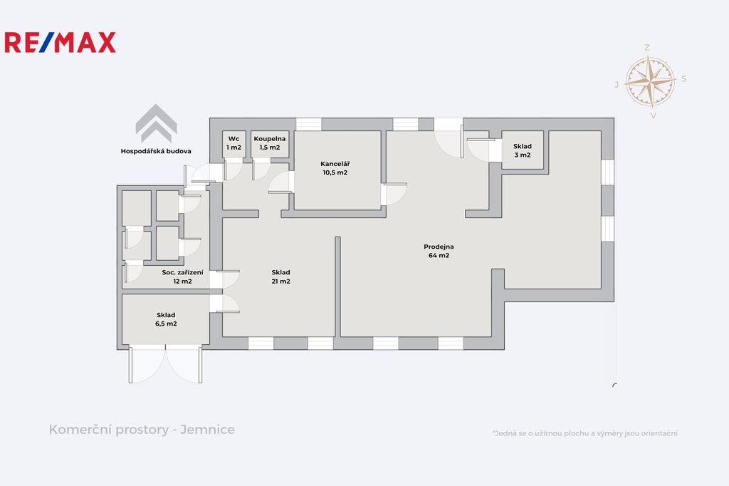Hlavní budova nabízí 124 m² obchodních prostor s kompletním zázemím, včetně kanceláře, WC a sprchy. Na hlavní budovu navazuje hospodářská budova o velikosti 64 m², která může sloužit jako sklad, dílna nebo prostor pro rozšíření podnikání. Tento dodatečný prostor poskytuje flexibilitu pro různé účely – od skladování zboží až po rozšíření výroby či servisu. Celková výměra pozemku činí 569 m². Kromě samotných budov zahrnuje také parkoviště přímo před objektem, což zajišťuje pohodlné parkování pro zákazníky i zaměstnance.