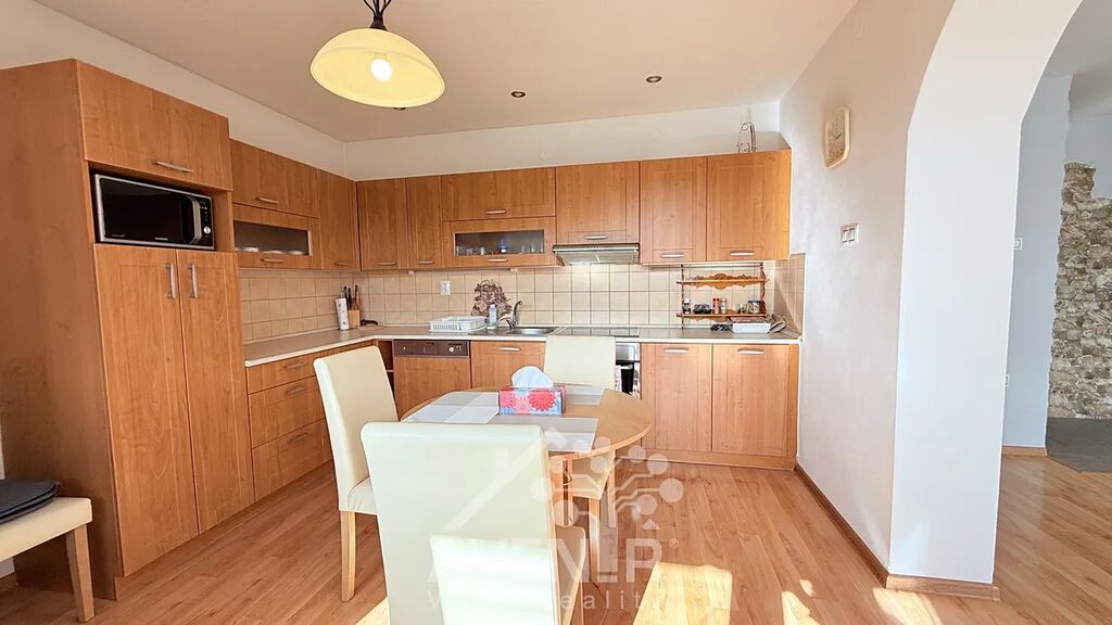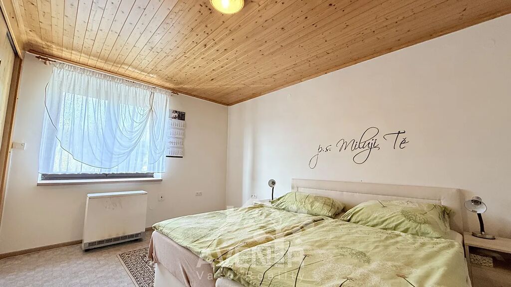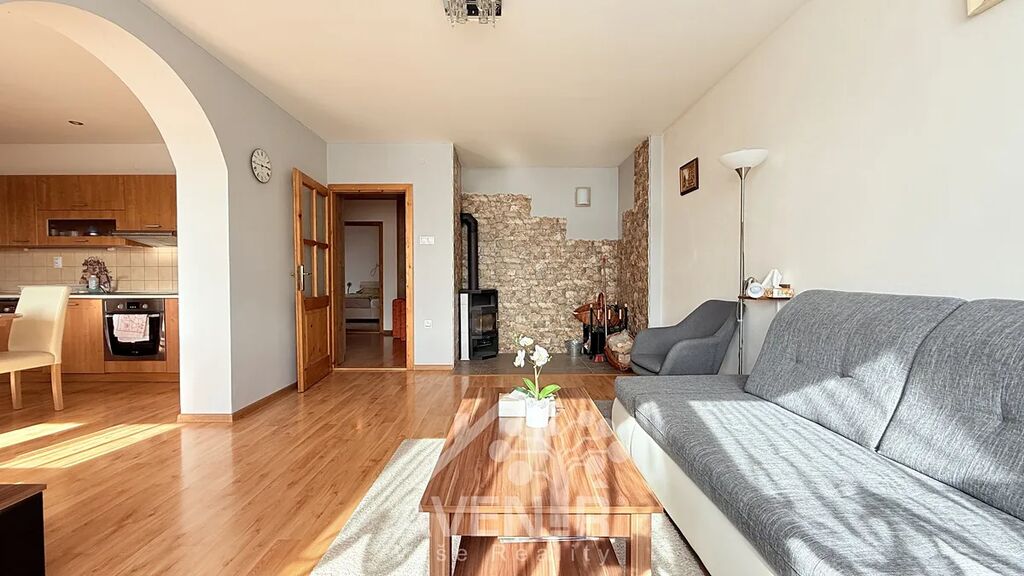 Nabízí prostorný obývací pokoj s krbovými kamny a obloukovým průchodem do kuchyně, která je vybavena spotřebiči – sklokeramická varná deska, vestavná trouba, mikrovlnná trouba a lednice. Dále ložnice, prostorná chodba a koupelna s wc.
