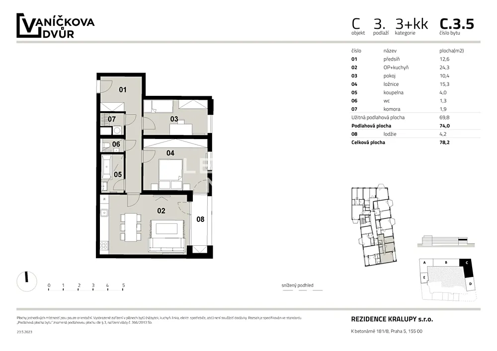 Moderní projekt Vaníčkova Dvůr vám nabízí k prodeji velkoryse řešený byt s dispozicí 3+kk o rozměrech 74 m² s lodžií 4,2 m². Byt se nachází v přízemí v nově vznikajícím projektu Vaníčkova Dvůr v srdci Kralup nad Vltavou.
