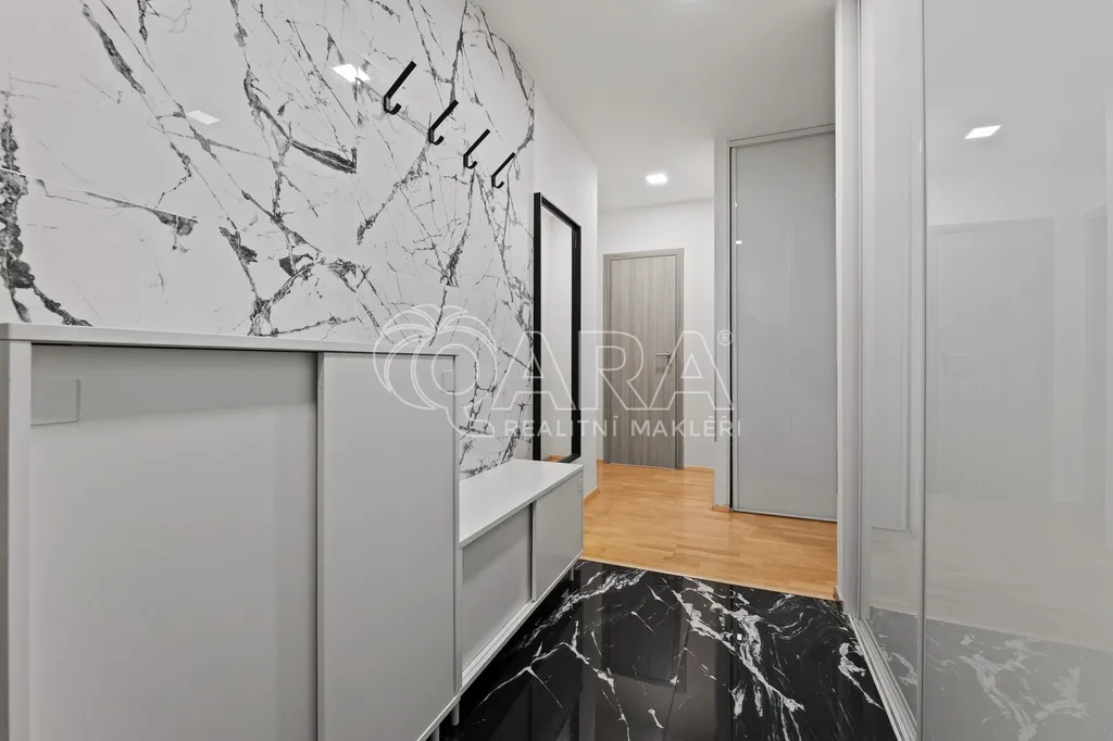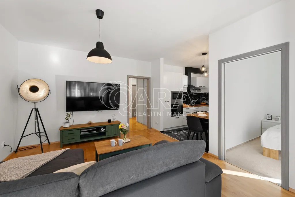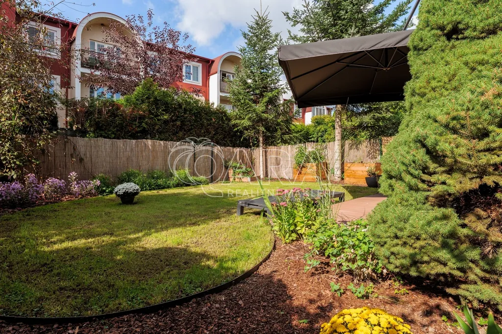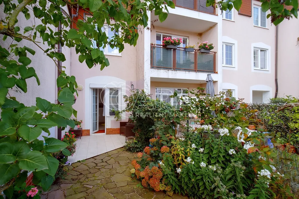 Dominantou bytu je obývací pokoj s kuchyňským koutem, ze kterého se přes zimní zahradu dostanete na západně orientovanou předzahrádku o velikosti 106 m². Ta nabízí příjemné posezení, dostatek soukromí a možnost trávit čas venku prakticky od jara do podzimu.