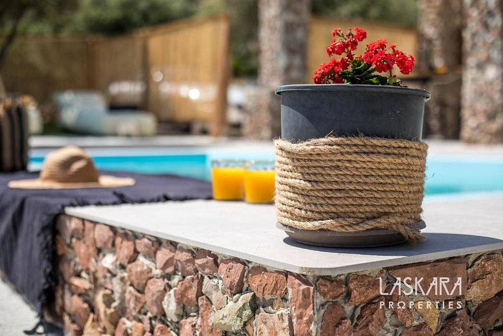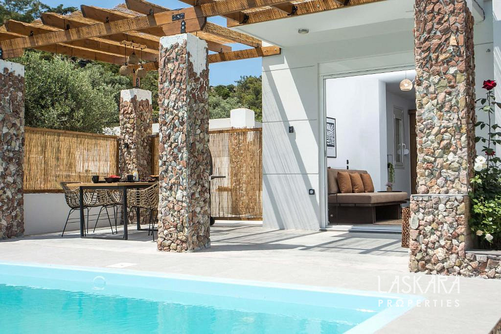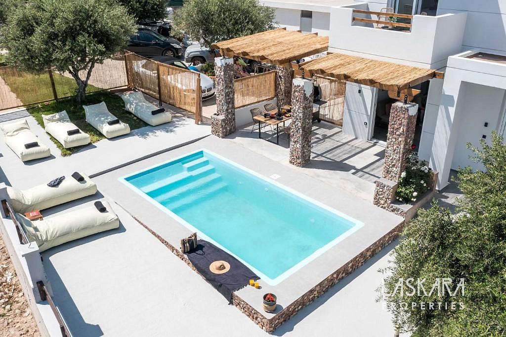 Exteriér doplňuje soukromý bazén obklopený olivovníky, posezení pod pergolou a terasa ideální pro ranní kávu při východu slunce.