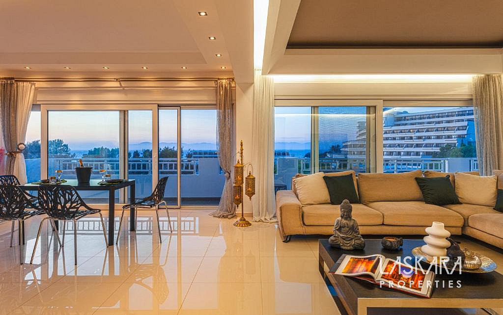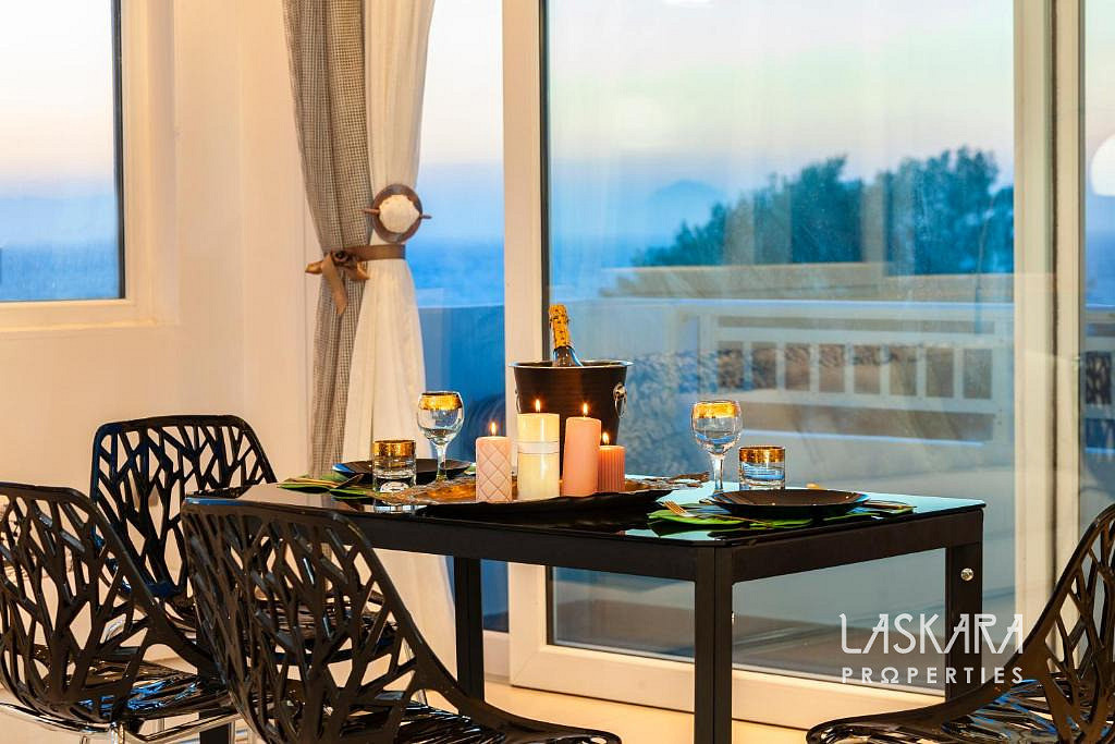 Panoramatická okna rámují dechberoucí pohled na Egejské moře a každý západ slunce proměňují v živý obraz. Elegantní, otevřený interiér je zalitý přirozeným světlem a působí uklidňujícím dojmem sofistikovaného komfortu.