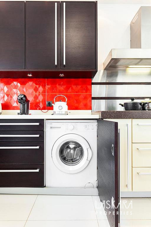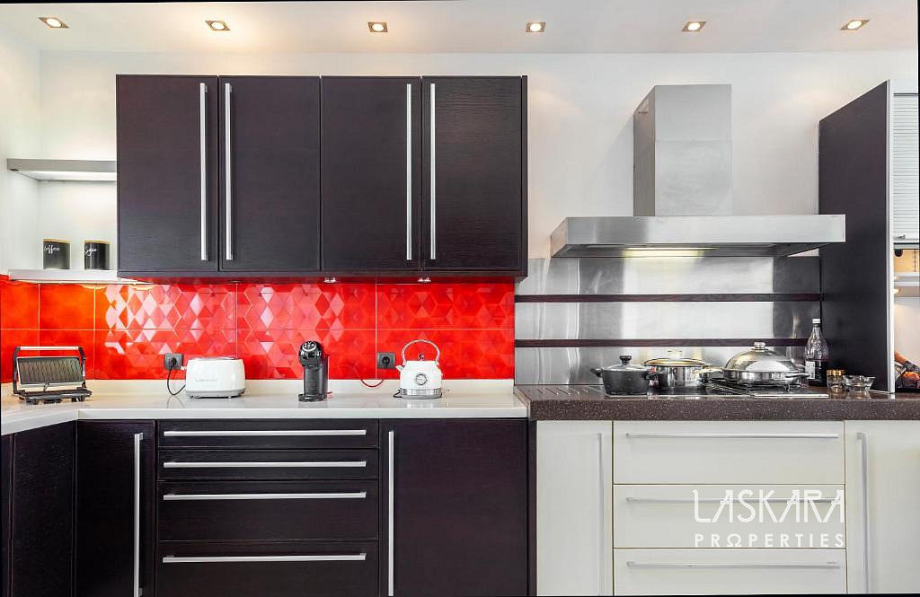 V srdci apartmánu se rozprostírá prostorný obývací pokoj s luxusními pohovkami, který přechází do jídelní části a moderní kuchyně vybavené kvalitními spotřebiči a elegantní červeno-černou kombinací. Každý kout působí útulně, sofistikovaně a dýchá klidem, který okamžitě obklopí každého, kdo vstoupí.
