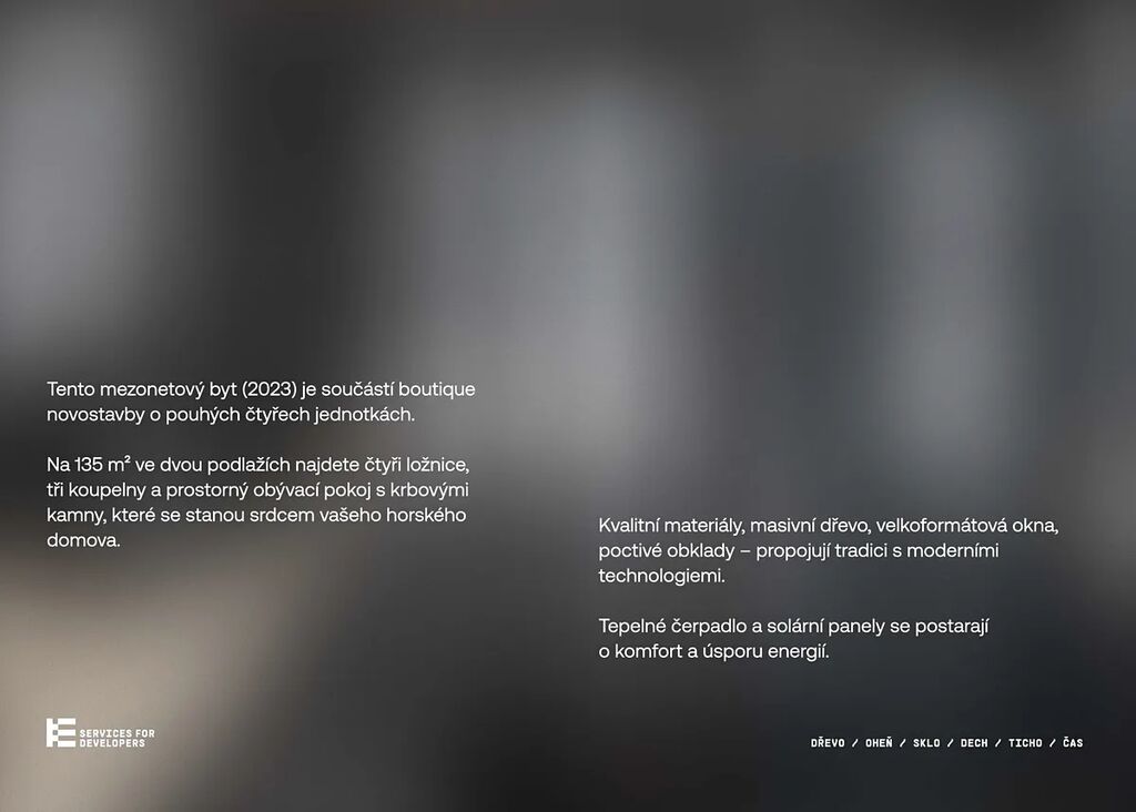 Tento výjimečný mezonetový byt o dispozici 5+kk se nachází v butikové novostavbě pouhých čtyř jednotek, přímo naproti hlavnímu lyžařskému svahu v Peci pod Sněžkou.