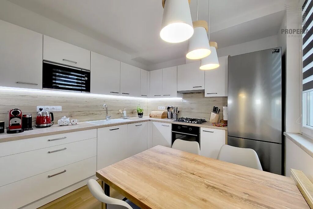 Byt prošel rozsáhlou a pečlivou rekonstrukcí, jejíž součástí byla mírná změna dispozice, vyzdění bytového jádra, instalace nových rozvodů elektřiny, položení moderních podlah, montáž policového systému regálů v šatně a zhotovení kuchyňské linky na míru.