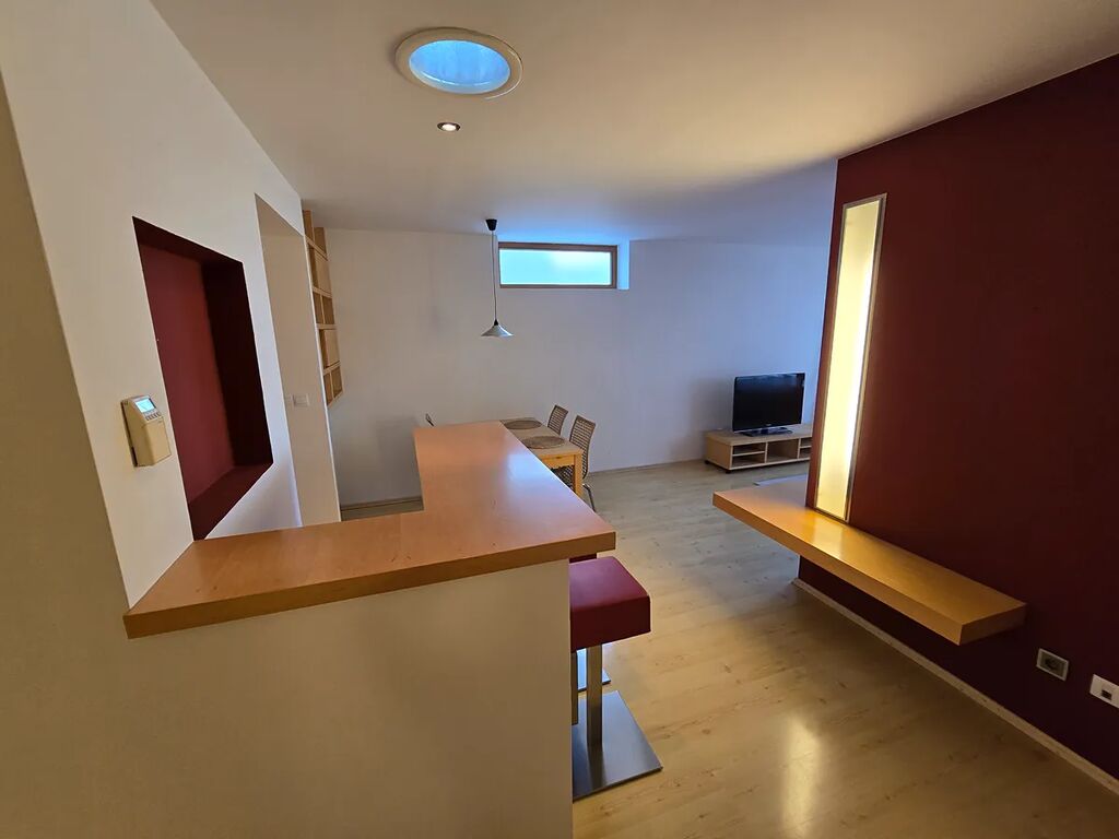 Byt se nachází v 5.NP/6NP a je moderní dostavbou cihlového bytového domu, s novým výtahem.