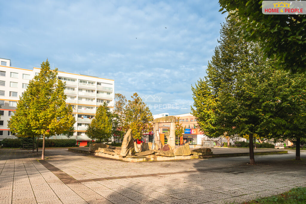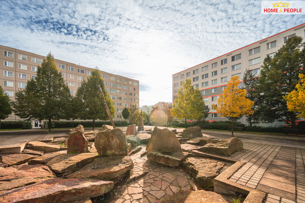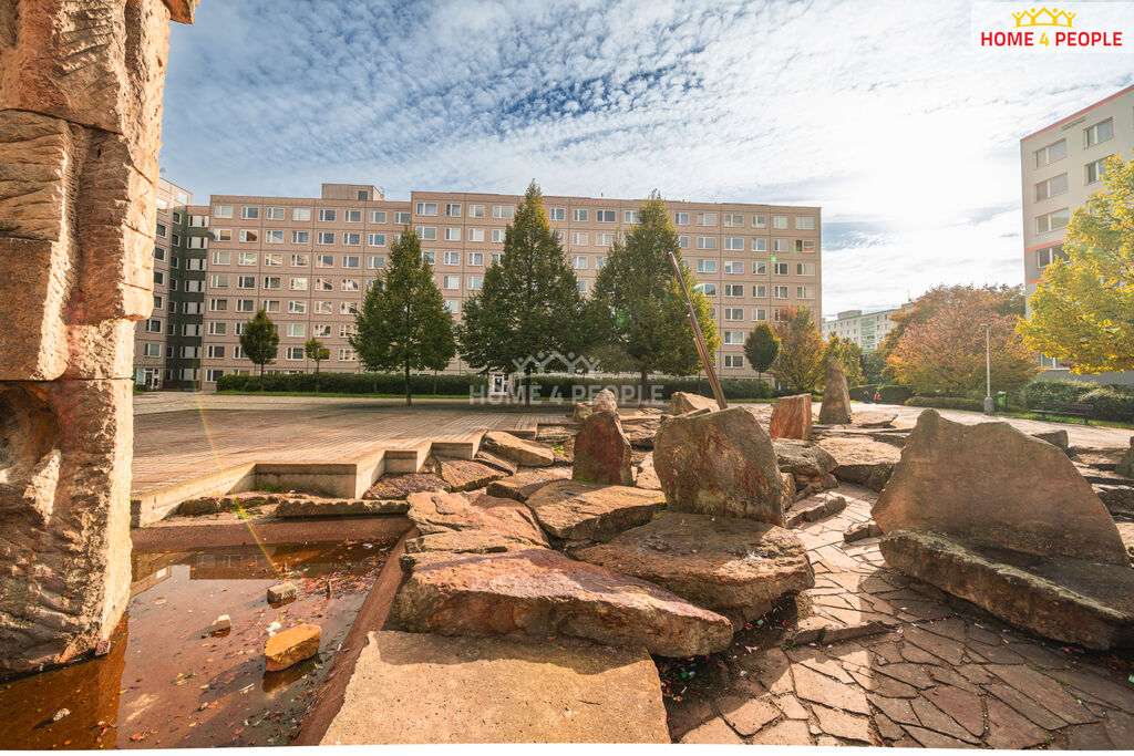 Z jedné strany bytu je příjemný výhled do klidného vnitrobloku, ve kterém se nachází malé náměstí s uměleckou instalací z kamene – několik kamenů rozmístěných vedle sebe vytváří zajímavý a odpočinkový prostor.