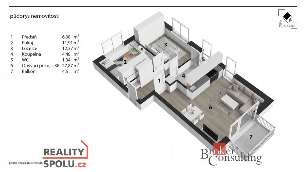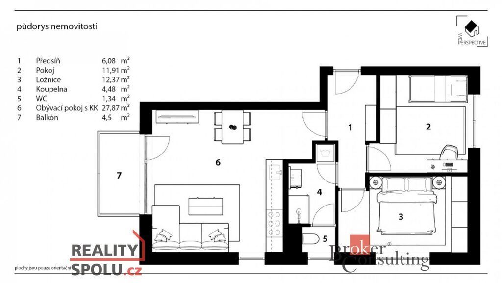 Byt tvoří prostorná chodba, 2 samostatné neprůchozí pokoje, koupelna, WC, obývací pokoj s kuchyňským koutem a balkón.