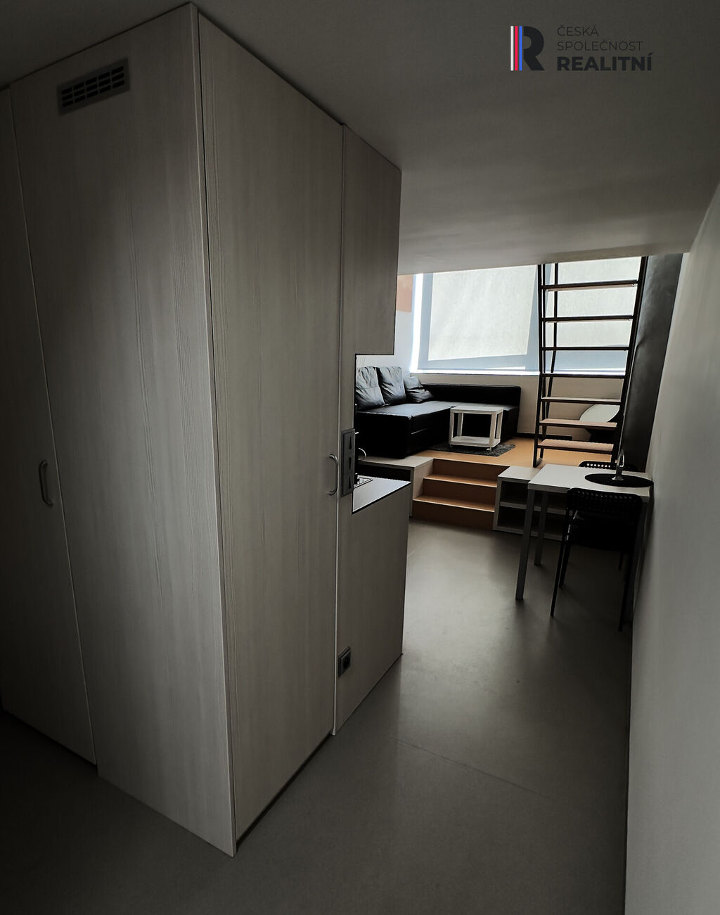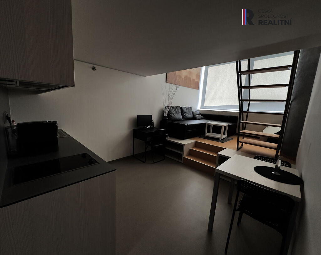Praktické uspořádání bytu nabízí v přízemí kuchyňský kout s jídelním stolem a malým pracovním koutem, obývací část se sedačkou a televizí, úložný prostor s vestavěnou skříní a koupelnu s toaletou. Ve vestavěném patře se nachází manželské dvojlůžko, šatní skříň a velký pracovní stůl.