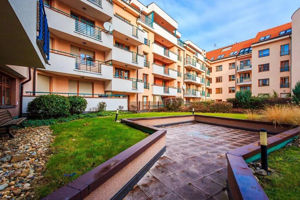 Byt disponuje obývacím pokojem, který je propojený s kuchyní, dále jsou zde dvě ložnice, koupelna s vanou, toaleta, komora a prostorná předsíň s vestavěnými skříněmi. Obě ložnice mají orientovaná okna do klidného a zeleného vnitrobloku. K bytu náleží prostorná sklepní kóje, parkovací stání a společná zahrada orientovaná do vnitrobloku. Samozřejmostí domu je také sušárna i kolárna.
