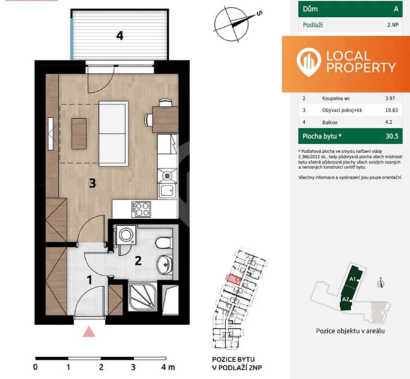 Dispozice bytu - při vstupu je předsíň s vestavěnou skříní. Vpravo se nachází koupelna se sprchovým koutem, pračkou a WC. Z chodby je dále vstup do pokoje s kompletně vybavenou kuchyňskou linkou - sklokeramická varná deska, horkovzdušná trouba, myčka, digestoř, lednice s mrazákem. Byt je vybaven rekuperací, díky které je v domácnosti zajištěn stálý přísun čerstvého vzduchu. Ten je filtrován a ohříván teplem odcházejícího vzduchu. V bytě je zajištěno zdravé větrání bez zbytečných tepelných ztrát. Orientace bytu je na západ.